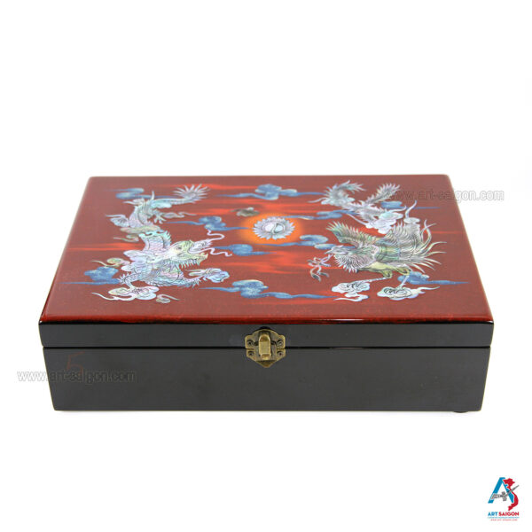 Boite à Bijoux en Bois Laqué et Nacre – Motif Dragon et Phénix (L30cm)(réf. S59-9193)Disponibilité : 3 en stock