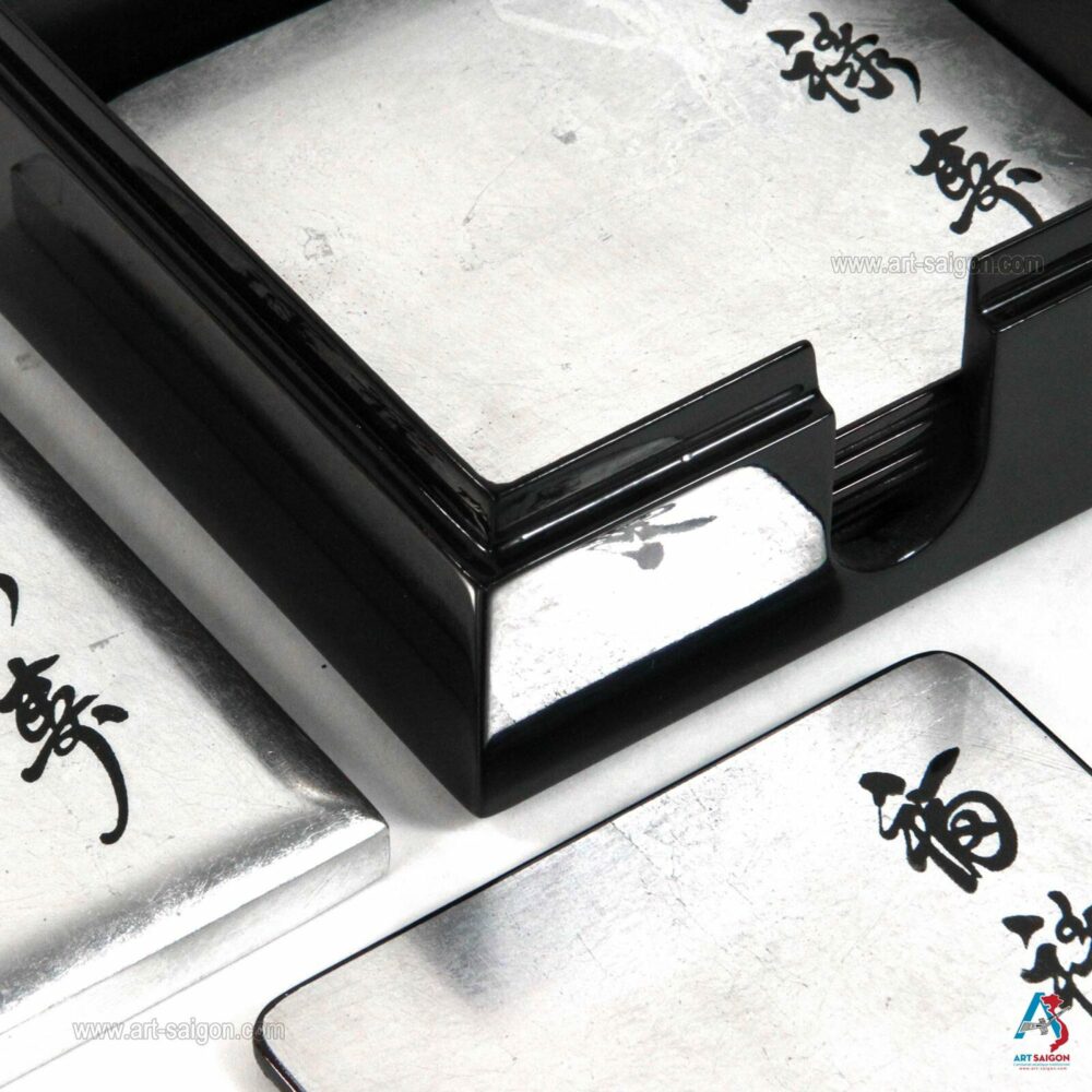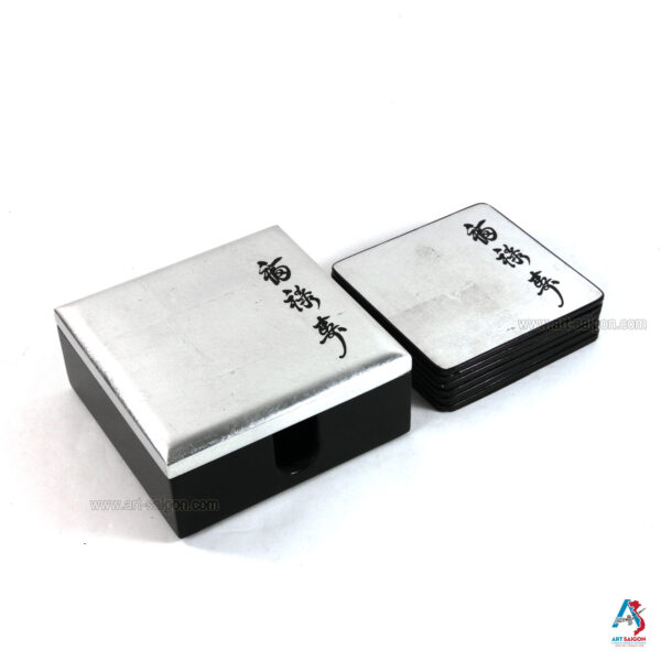 Cette boite comprend 6 sous-verres qui sont en bois laqué argenté afin de pourvoir les ranger après chaque utilisation. Une dizaine de couche de laque sont nécessaires à sa fabrication artisanale avec des techniques traditionnelles d’autrefois.