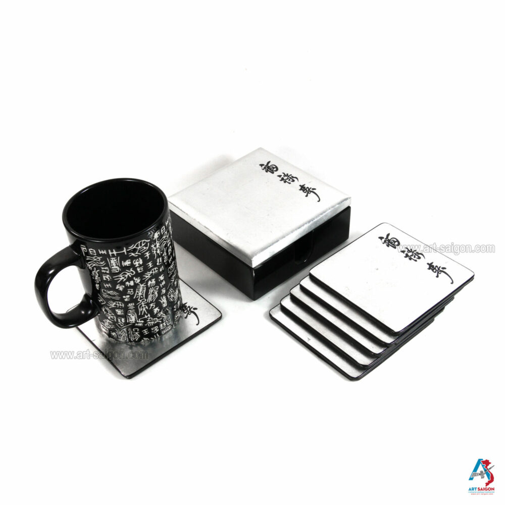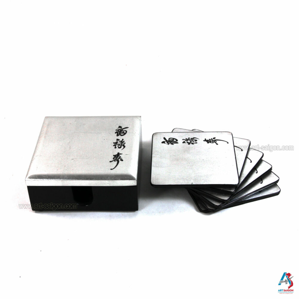 Boite de 6 Sous-Verres en Bois Laqué Argenté – Motif Écriture Chinoise (Réf. S64-0792)Disponibilité : 3 en stock