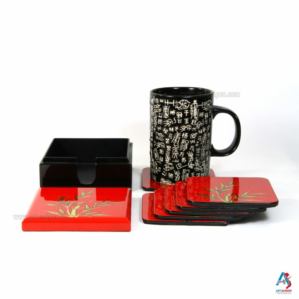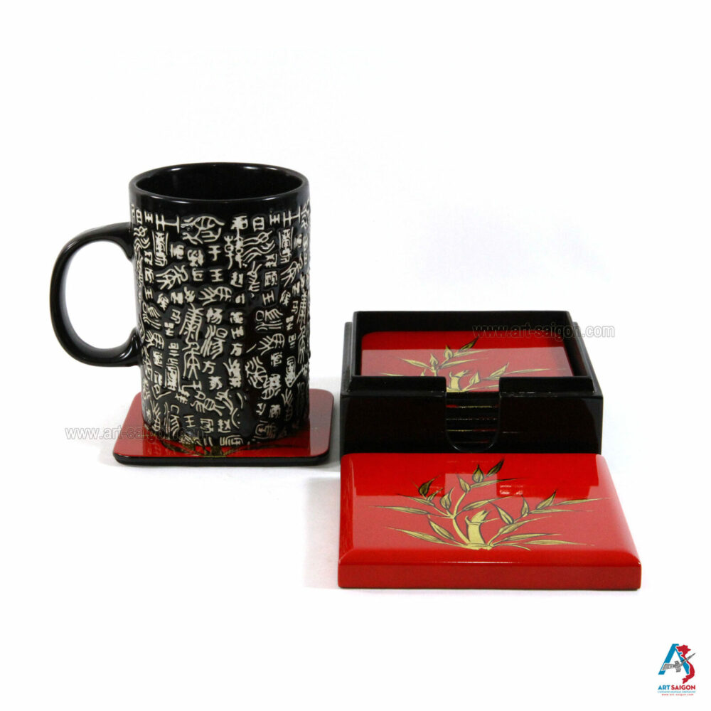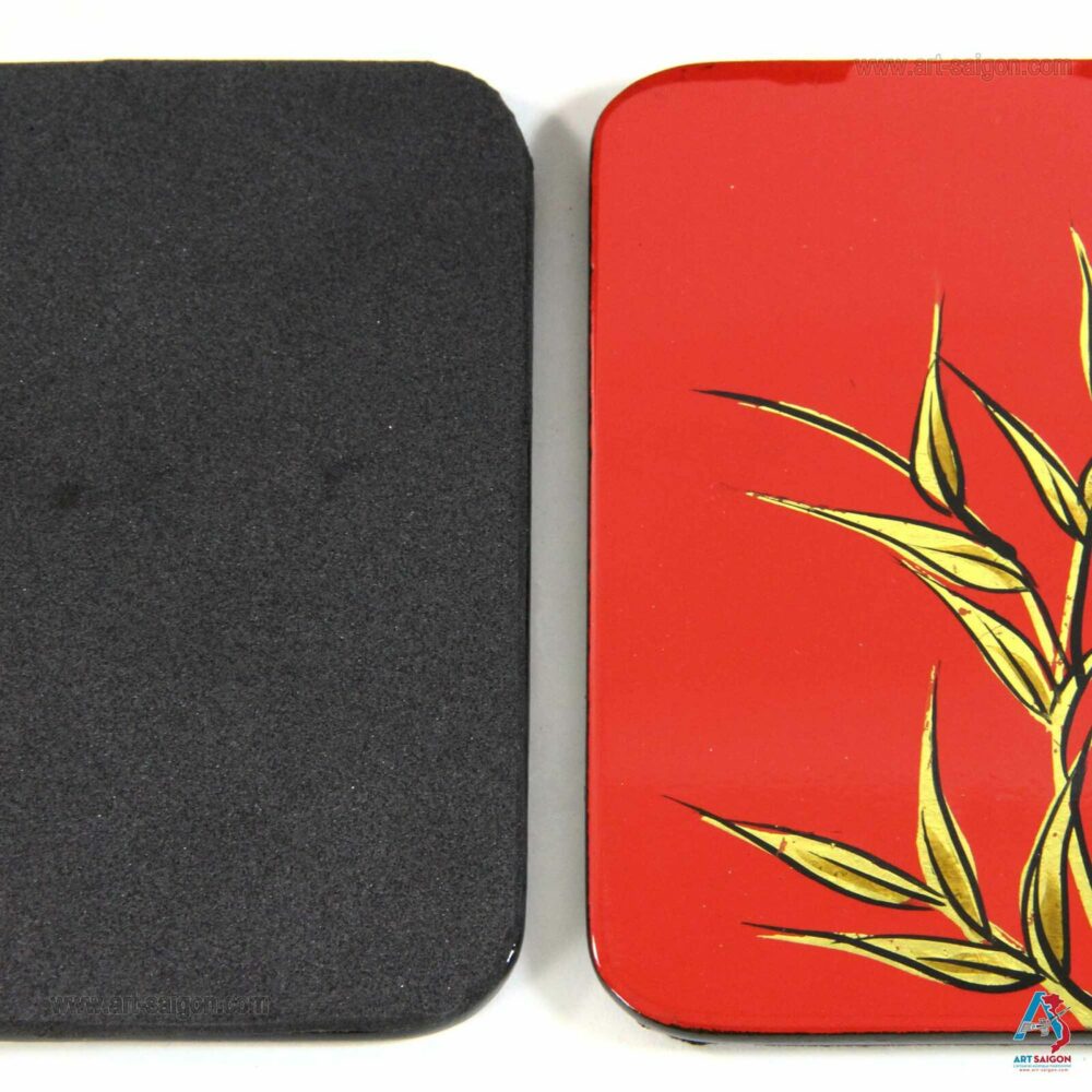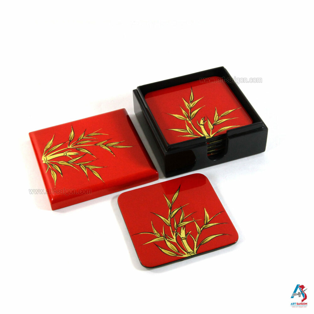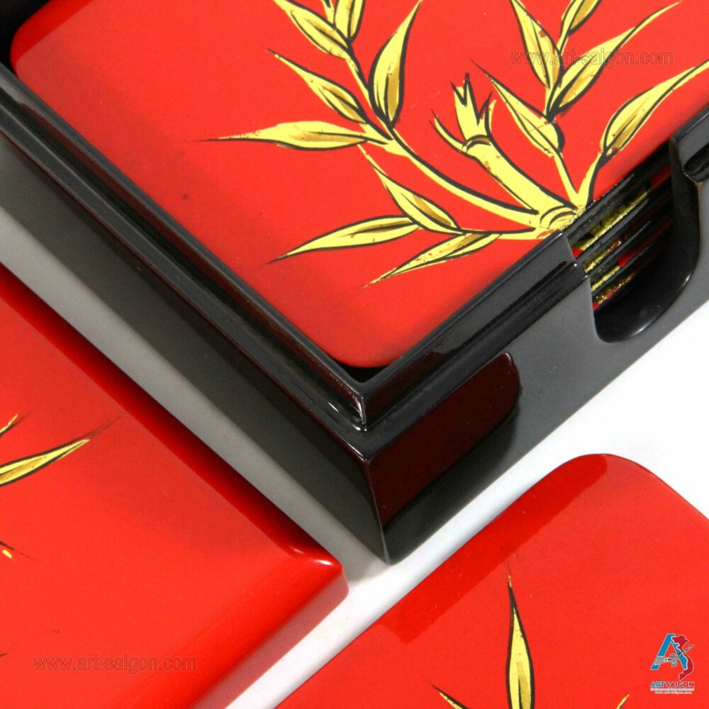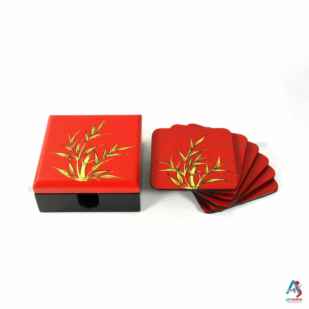 Cette boite comprend 6 sous-verres qui sont en bois laqué rouge afin de pourvoir les ranger après chaque utilisation. Le bambou en couleur doré sur le dessus du couvercle et des sous-verres signifie la réussite qui est un symbole très fréquemment utiliser dans la culture asiatique. Enfin, une dizaine de couche de laque sont nécessaires à sa fabrication artisanale avec des techniques traditionnelles d’autrefois.