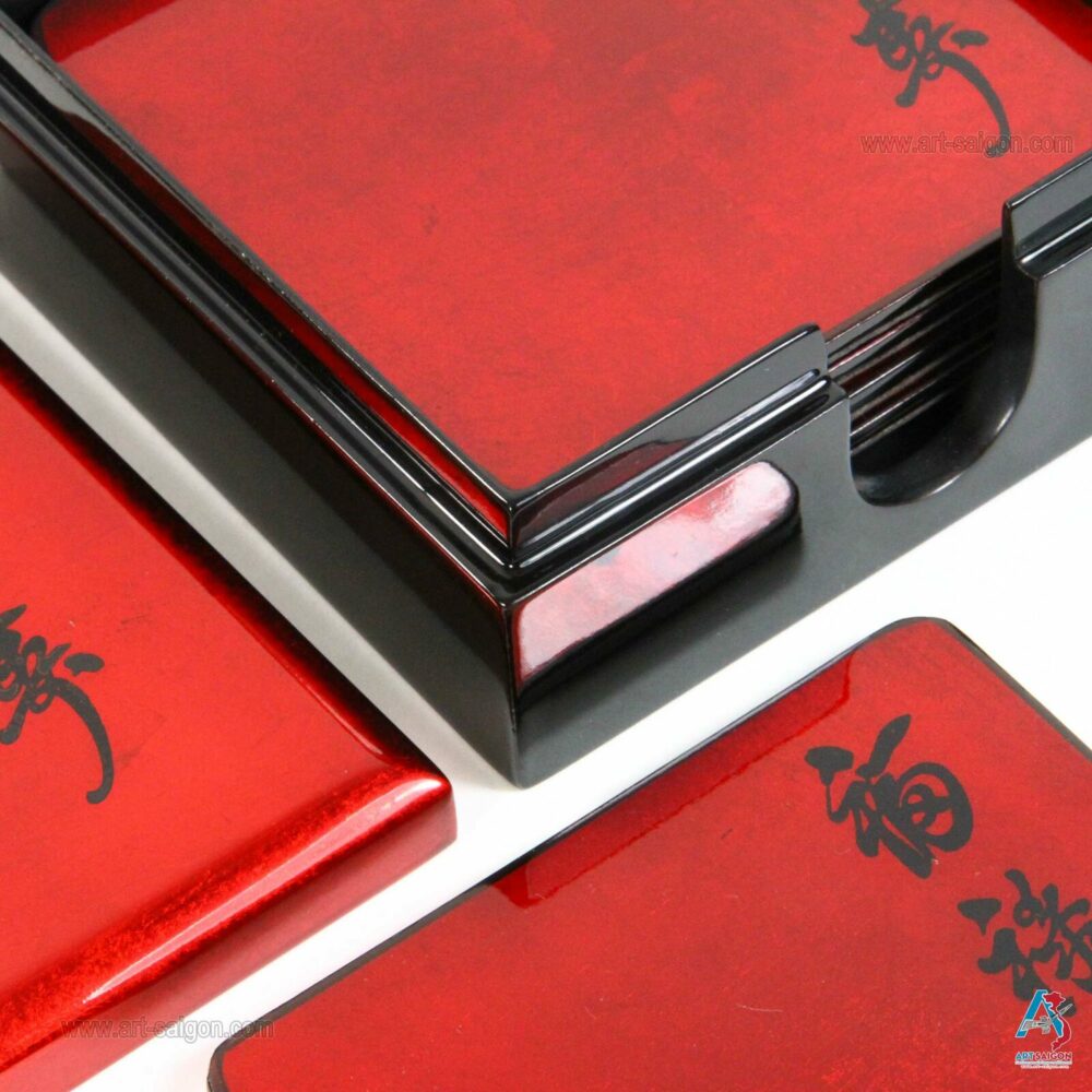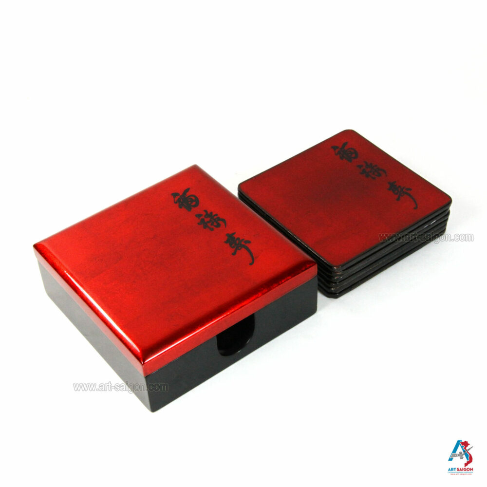 Cette boite comprend 6 sous-verres qui sont en bois laqué rouge afin de pourvoir les ranger après chaque utilisation. Une dizaine de couche de laque sont nécessaires à sa fabrication artisanale avec des techniques traditionnelles d’autrefois.
