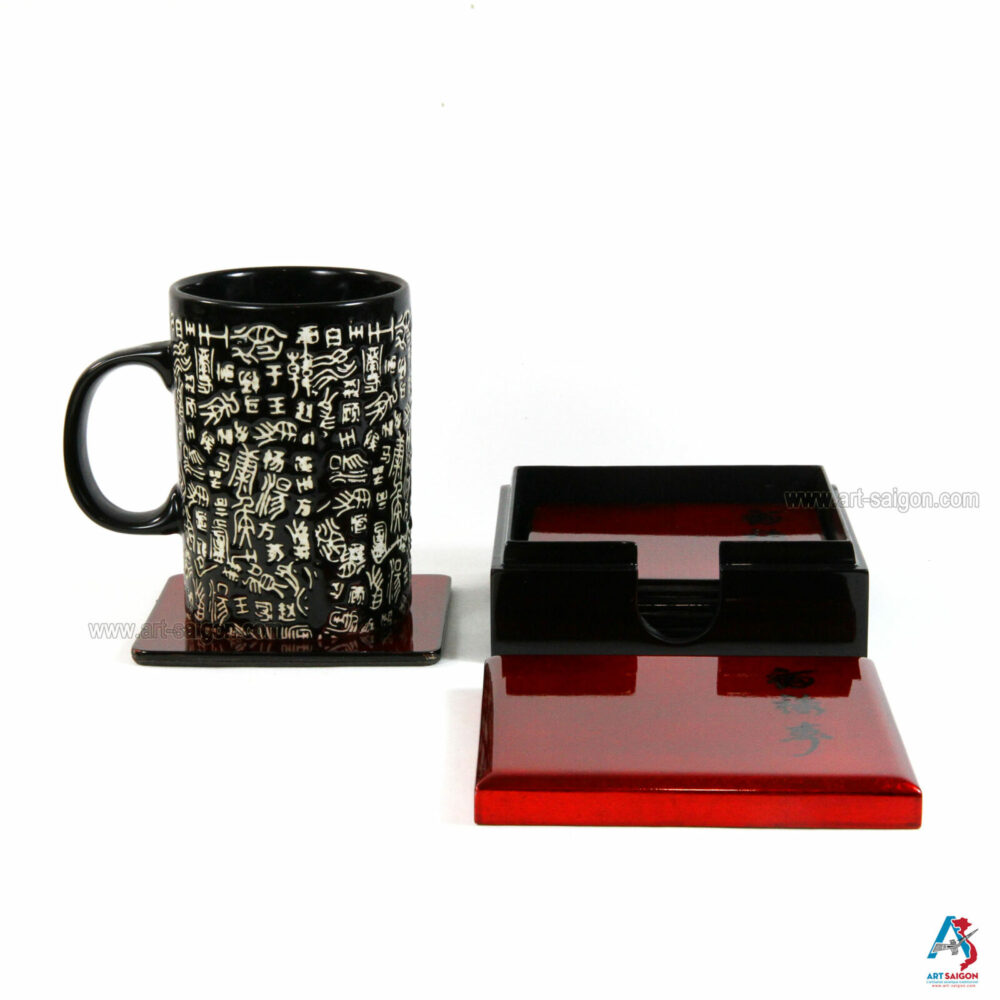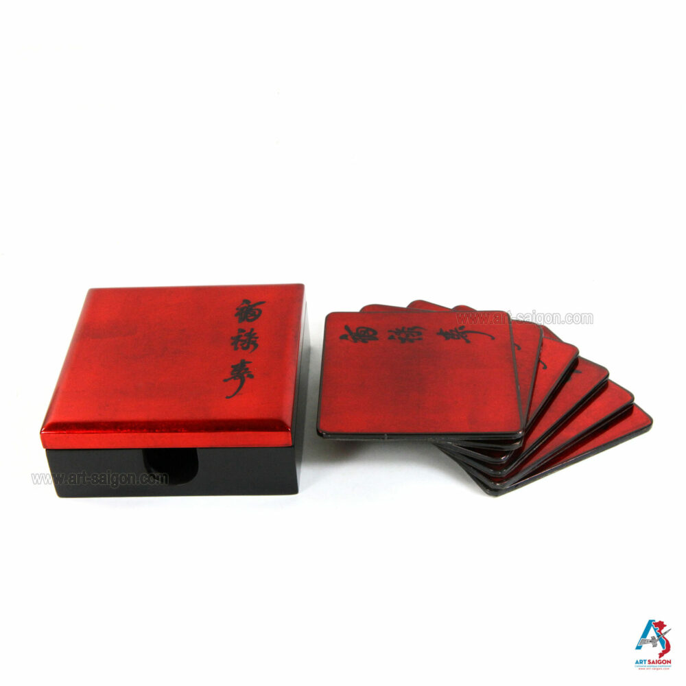 Boite de 6 Sous-Verres en Bois Laqué Rouge – Motif Écriture Chinoise (Réf. S64-0760)Disponibilité : 1 en stock