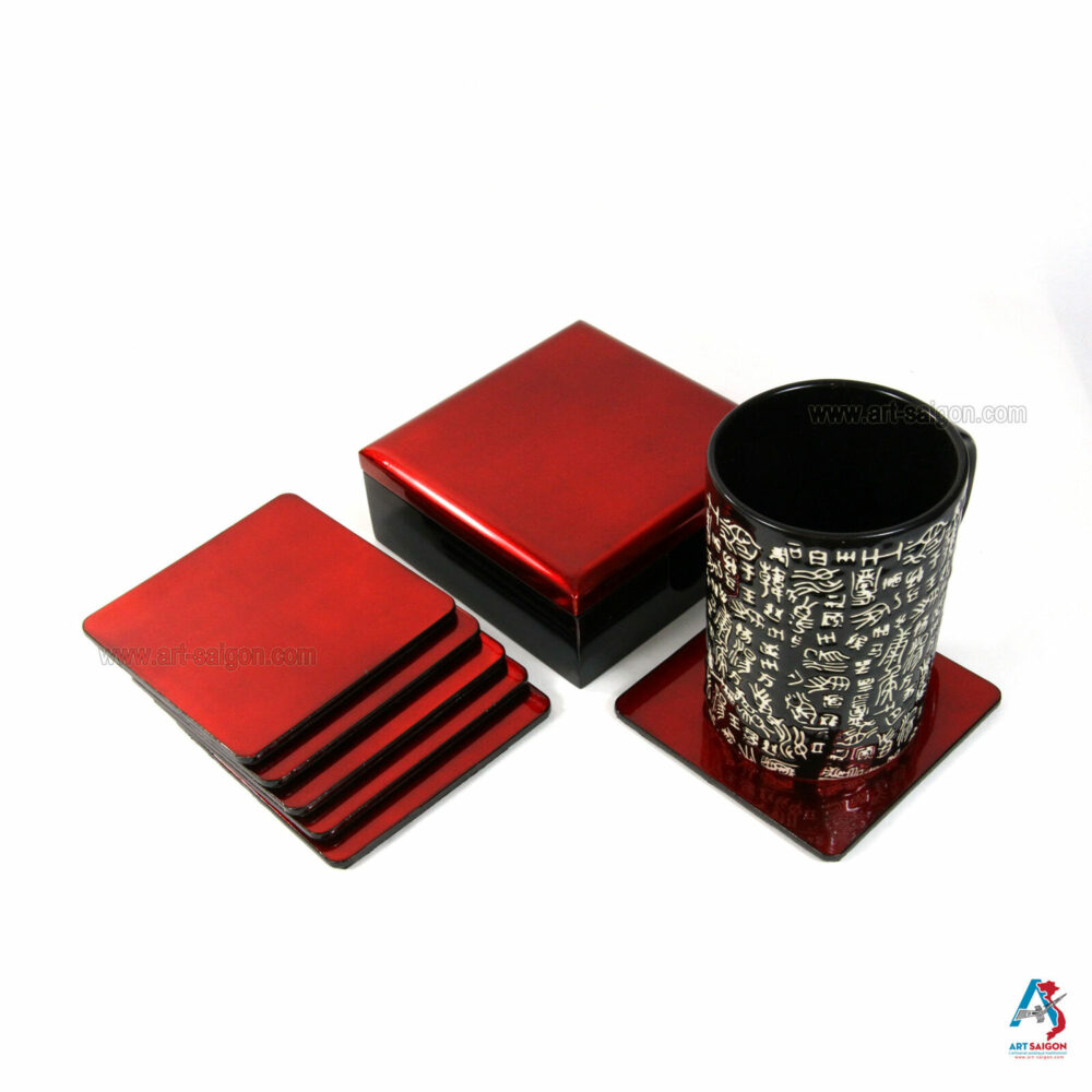 Cette boite comprend 6 sous-verres qui sont en bois laqué rouge afin de pourvoir les ranger après chaque utilisation. Une dizaine de couche de laque sont nécessaires à sa fabrication artisanale avec des techniques traditionnelles d’autrefois.