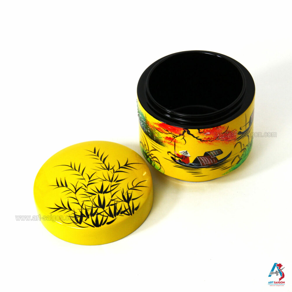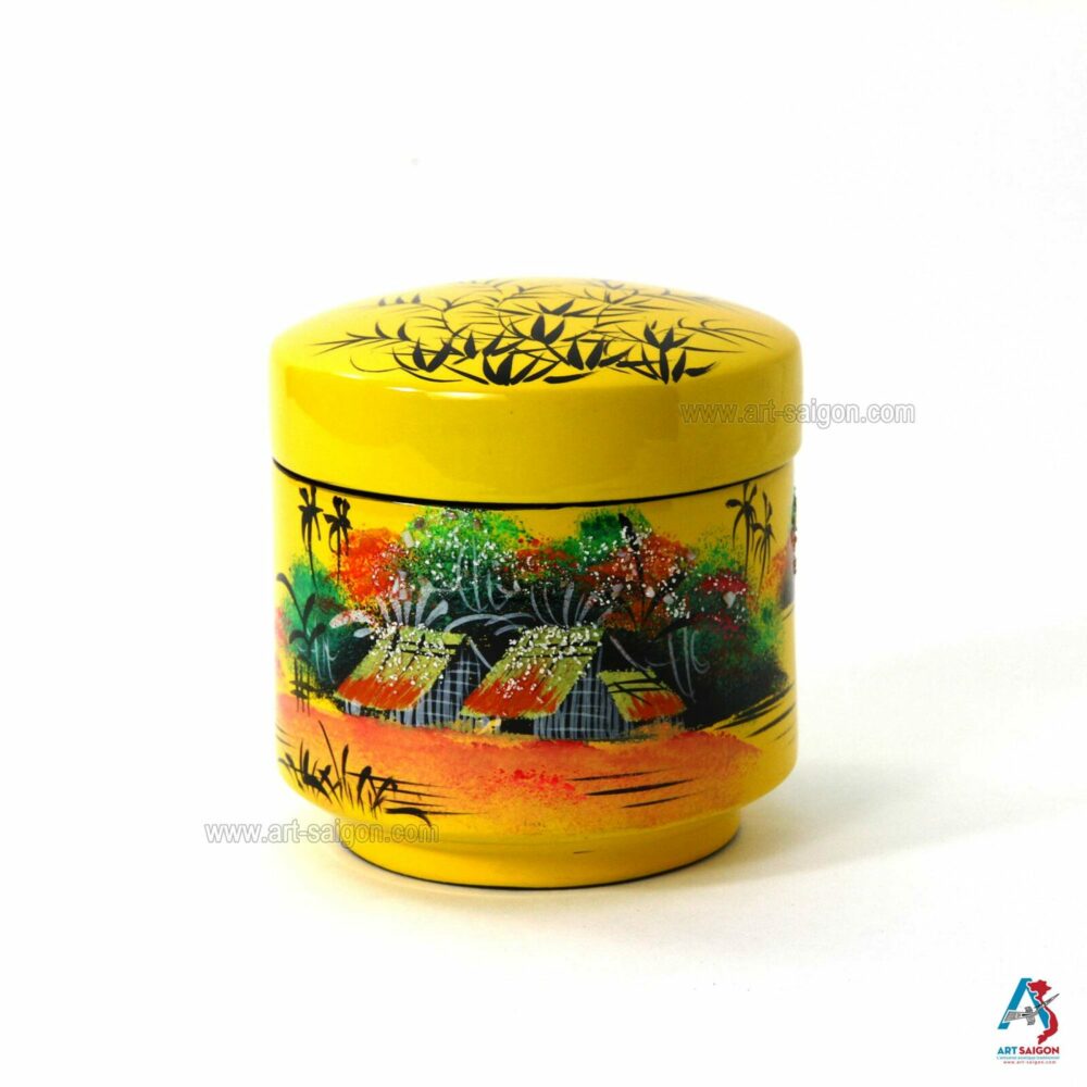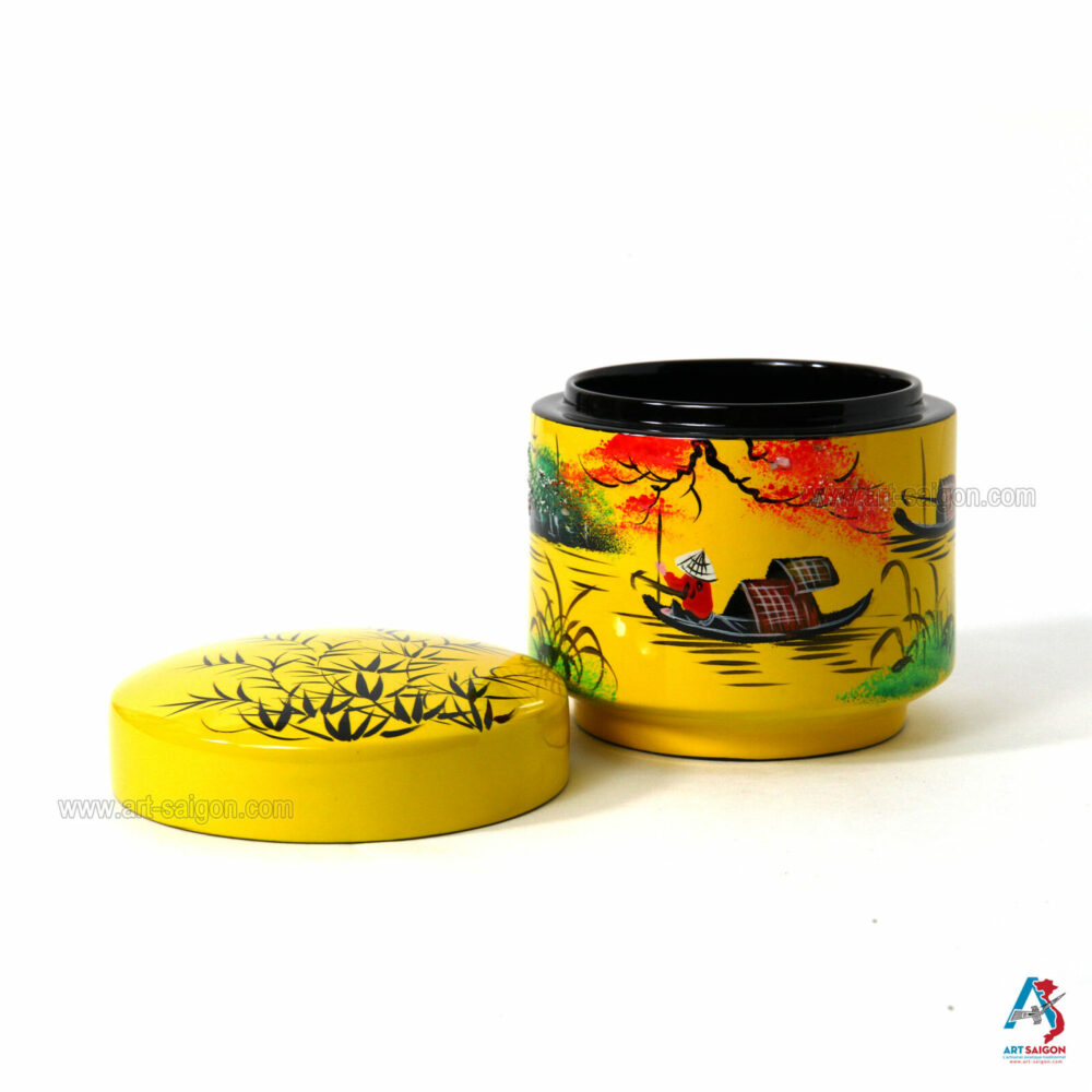 Boîte en Bois Laqué Jaune – Bocal Ronde H10cm – La Campagne du Vietnam (réf. S59-9072)Disponibilité : 1 en stock