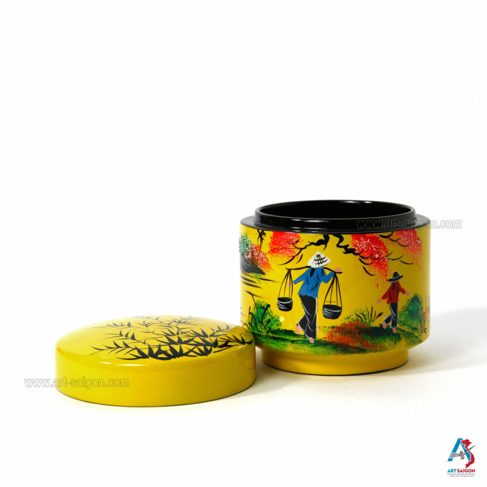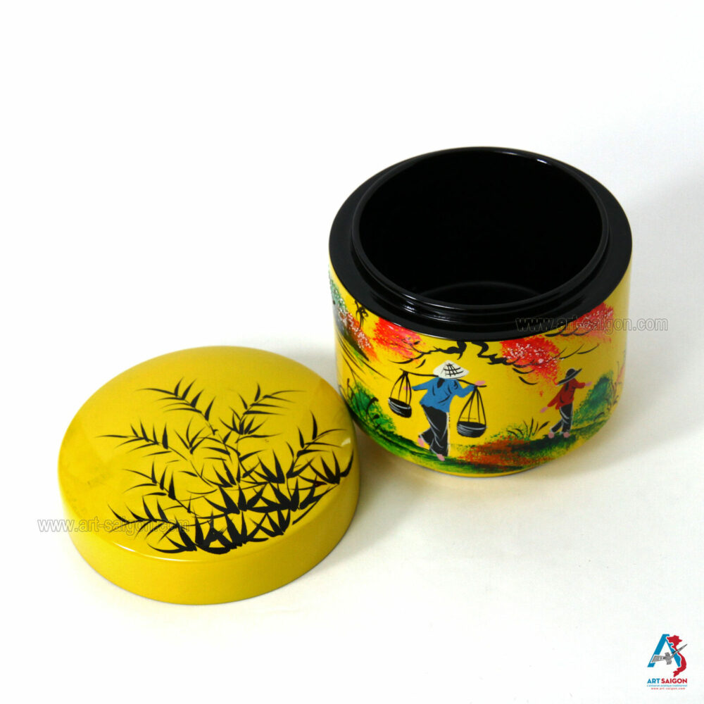 Belle boîte ronde avec couvercle afin de ranger diverses choses à l’intérieur comme des bijoux, bagues, boucle d’oreille, bracelet, colliers et autres. Elle est fabriquée en bois laqué sur un fond jaune. Le dessin sur le dessus de la boite représente une scène de la campagne du Vietnam avec ses paysans et son paysage. Elle est faite entièrement à la main avec des techniques traditionnelles d’autrefois.