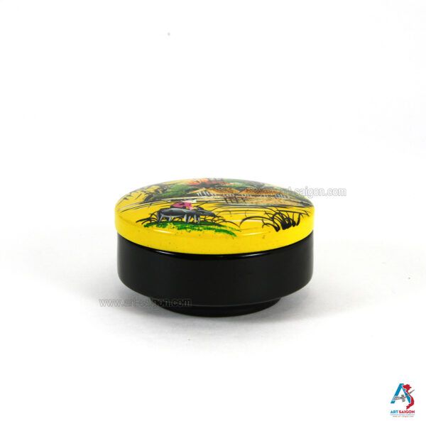 Belle boîte ronde plate avec couvercle afin de ranger diverses choses à l’intérieur comme des bijoux, bagues, boucle d’oreille, bracelet, colliers et autres. Elle est fabriquée en bois laqué sur un fond jaune. Le dessin sur le dessus de la boite représente une scène de la campagne du Vietnam avec ses paysans et son paysage. Elle est faite entièrement à la main avec des techniques traditionnelles d’autrefois.