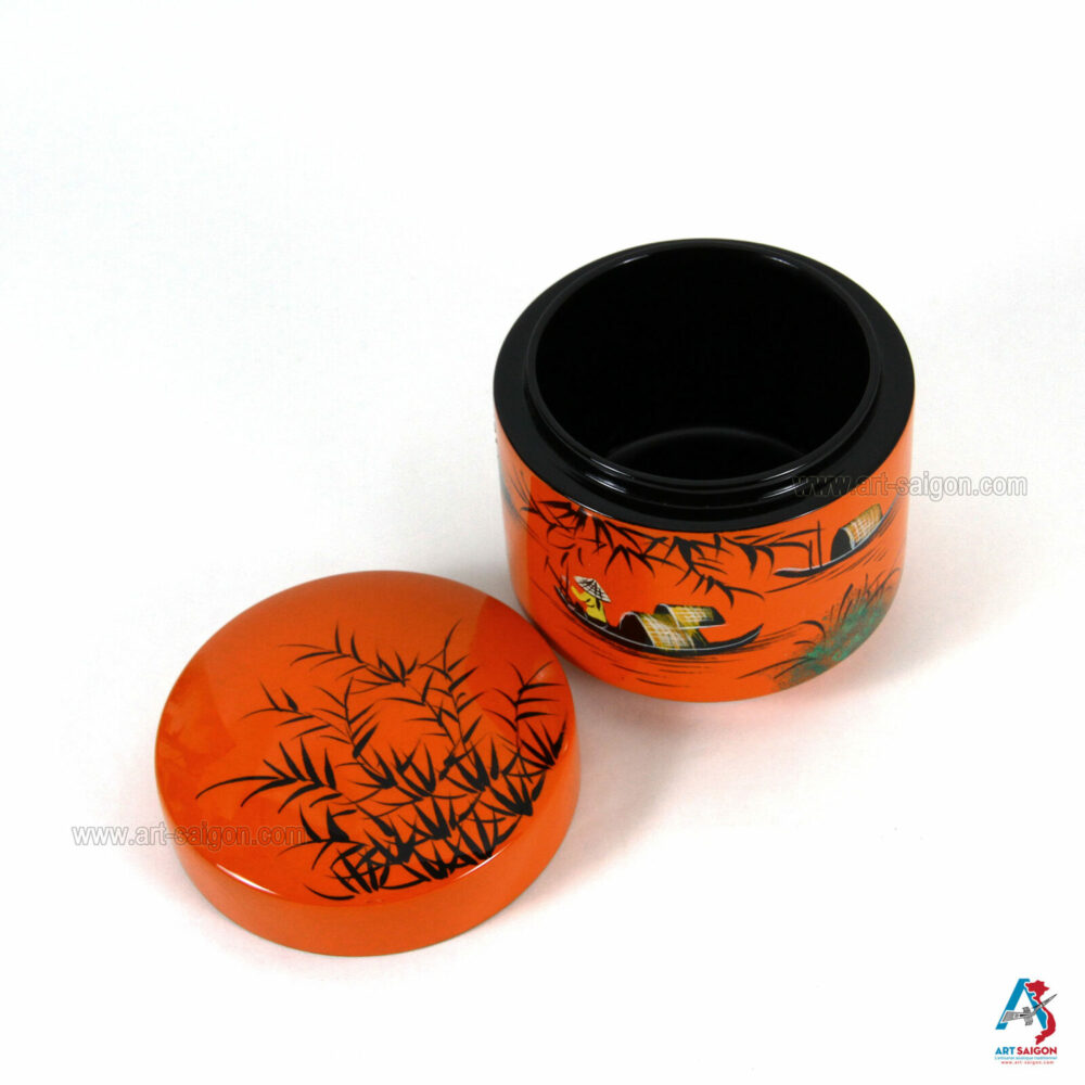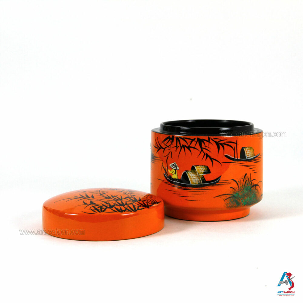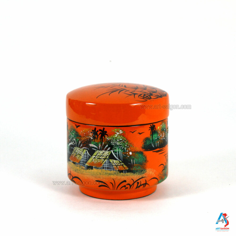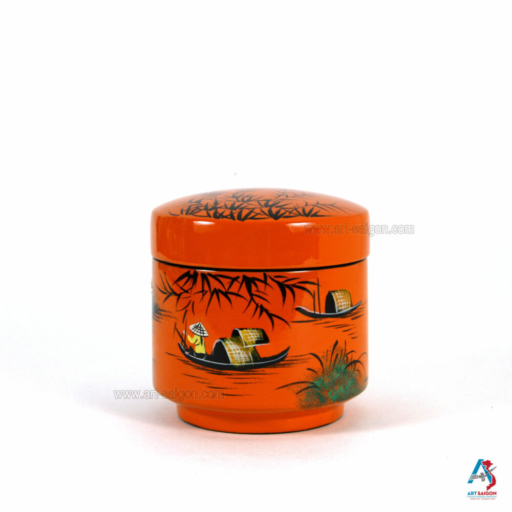 Belle boîte ronde avec couvercle afin de ranger diverses choses à l’intérieur comme des bijoux, bagues, boucle d’oreille, bracelet, colliers et autres. Elle est fabriquée en bois laqué sur un fond orange. Le dessin sur le dessus de la boite représente une scène de la campagne du Vietnam avec ses paysans et son paysage. Elle est faite entièrement à la main avec des techniques traditionnelles d’autrefois.
