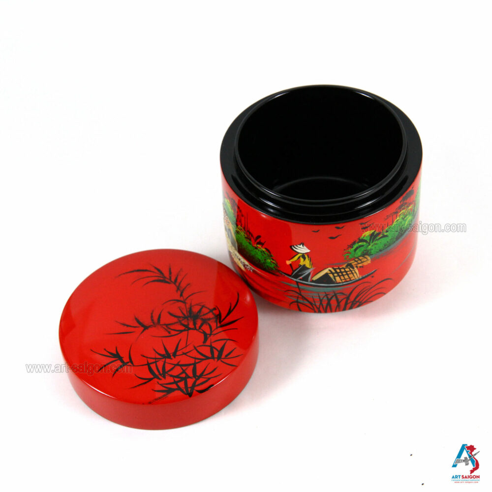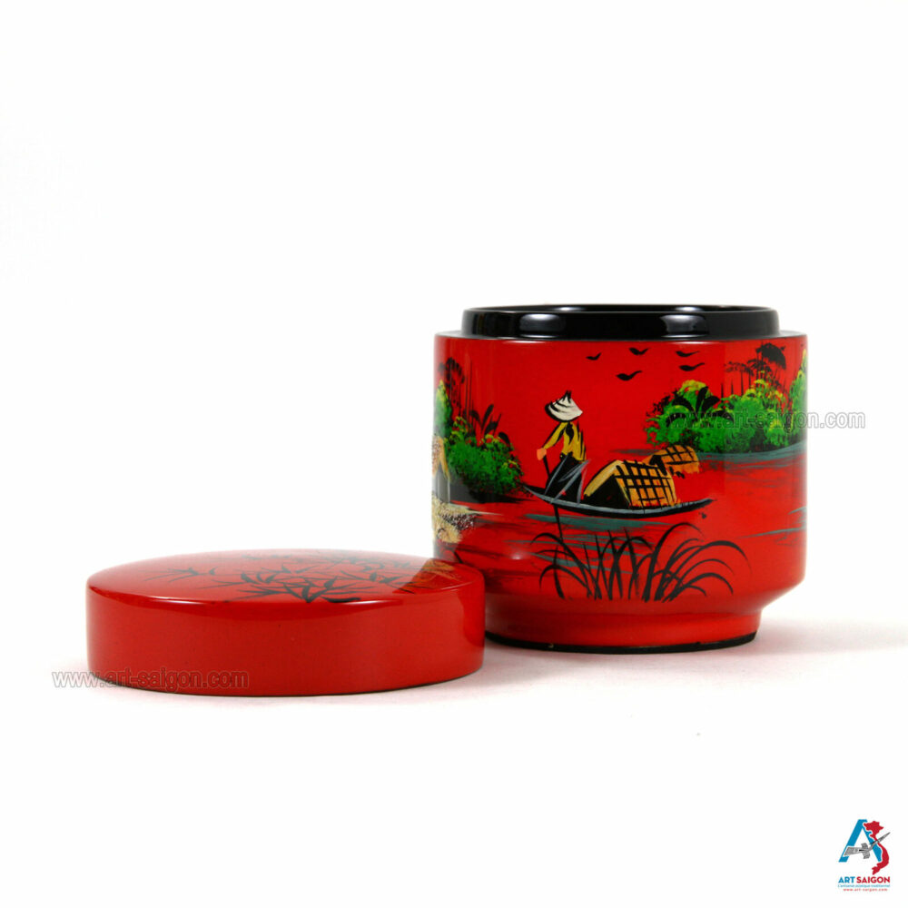 Belle boîte ronde avec couvercle afin de ranger diverses choses à l’intérieur comme des bijoux, bagues, boucle d’oreille, bracelet, colliers et autres. Elle est fabriquée en bois laqué sur un fond rouge. Le dessin sur le dessus de la boite représente une scène de la campagne du Vietnam avec ses paysans et son paysage. Elle est faite entièrement à la main avec des techniques traditionnelles d’autrefois.