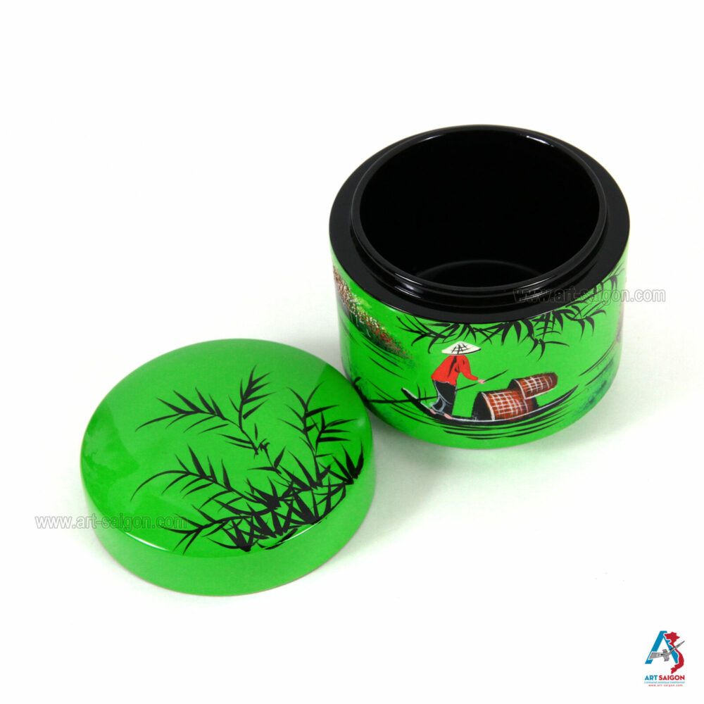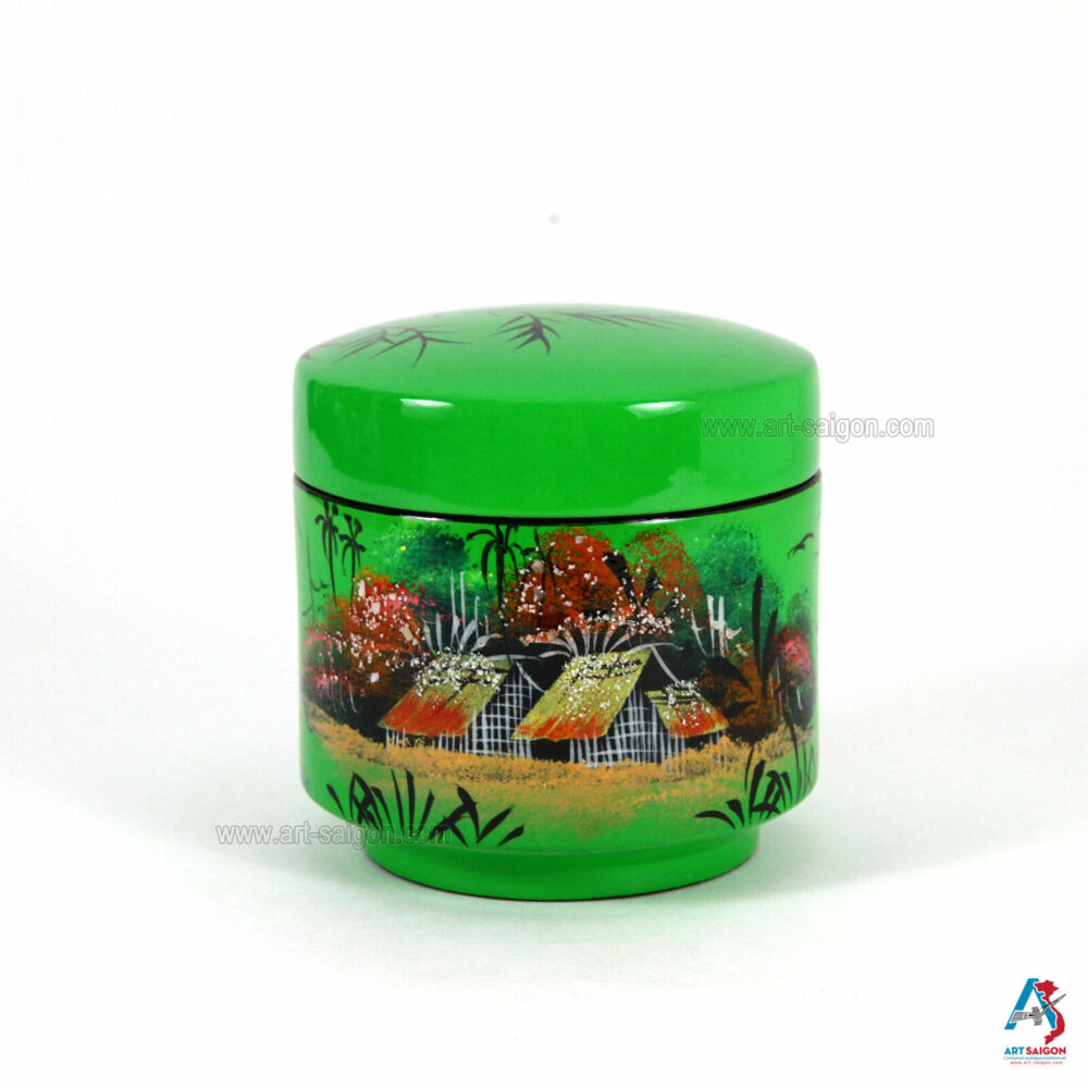 Boîte en Bois Laqué Vert – Bocal Ronde H10cm – La Campagne du Vietnam (réf. S59-9115)Disponibilité : 1 en stock