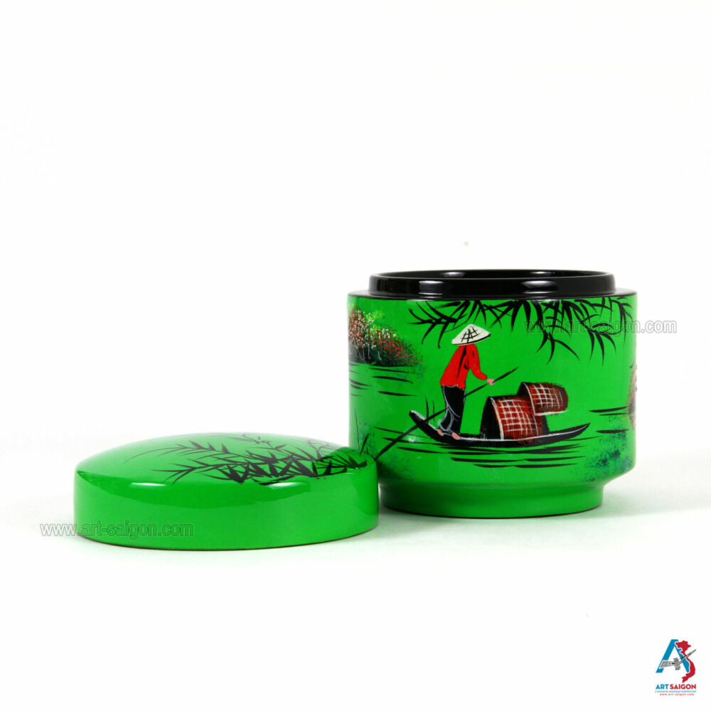 Belle boîte ronde avec couvercle afin de ranger diverses choses à l’intérieur comme des bijoux, bagues, boucle d’oreille, bracelet, colliers et autres. Elle est fabriquée en bois laqué sur un fond vert. Le dessin sur le dessus de la boite représente une scène de la campagne du Vietnam avec ses paysans et son paysage. Elle est faite entièrement à la main avec des techniques traditionnelles d’autrefois.