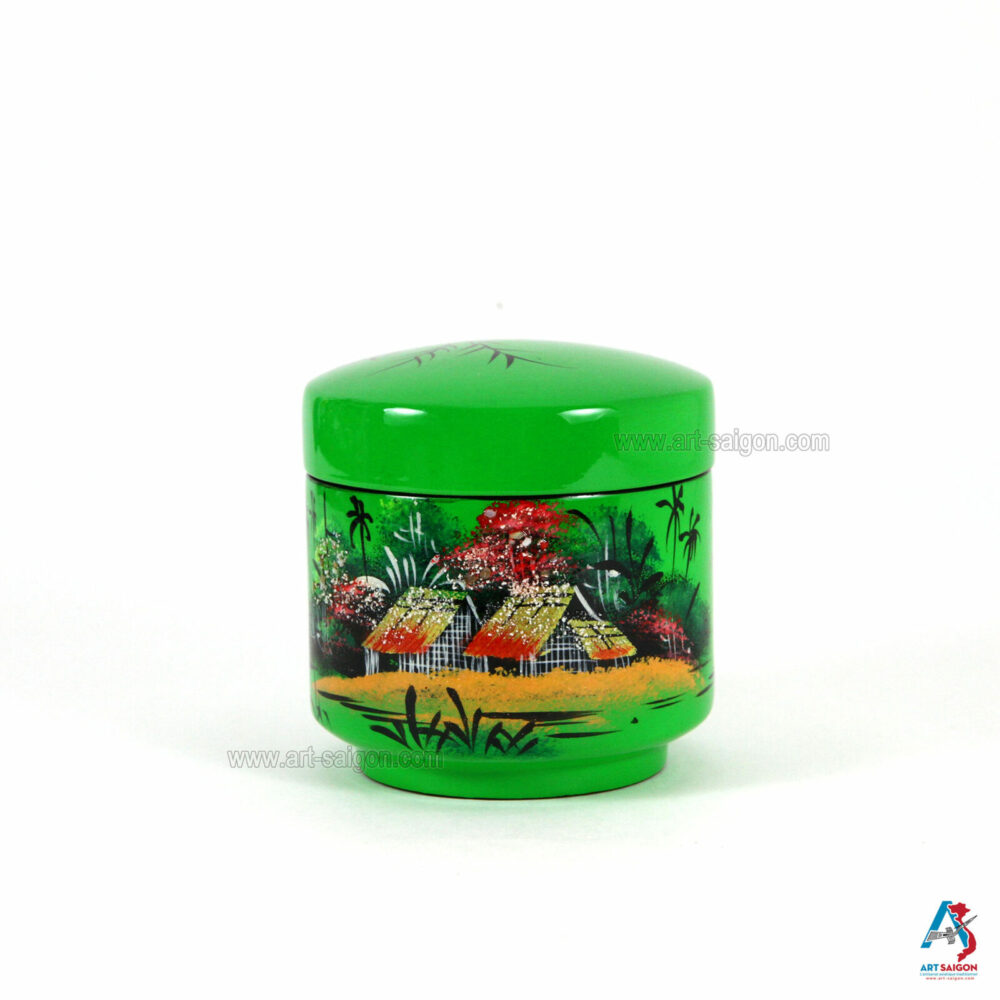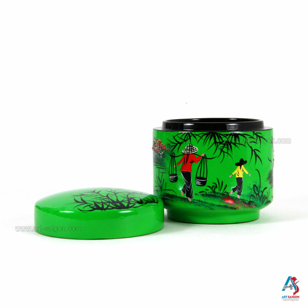 Belle boîte ronde avec couvercle afin de ranger diverses choses à l’intérieur comme des bijoux, bagues, boucle d’oreille, bracelet, colliers et autres. Elle est fabriquée en bois laqué sur un fond vert. Le dessin sur le dessus de la boite représente une scène de la campagne du Vietnam avec ses paysans et son paysage. Elle est faite entièrement à la main avec des techniques traditionnelles d’autrefois.