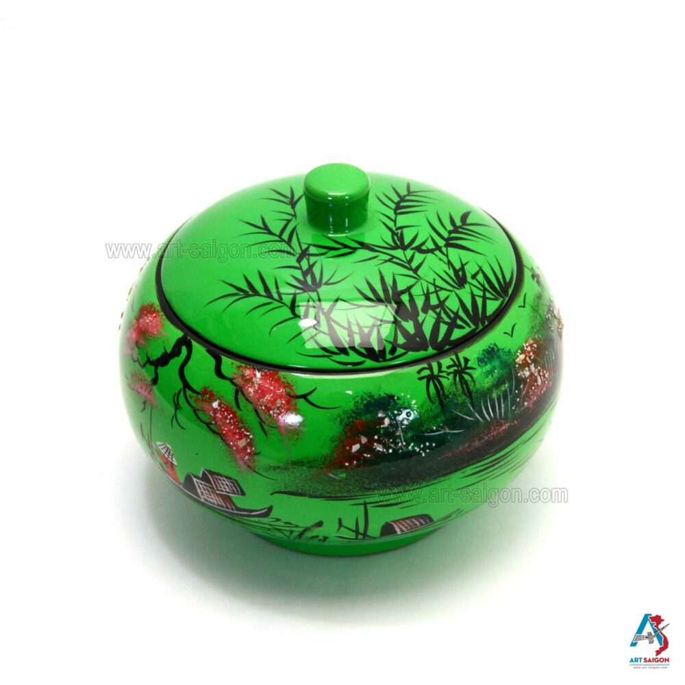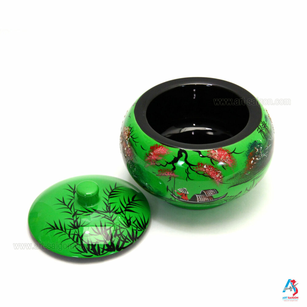 Boîte en Bois Laqué Vert - Ronde Ø15cm - La Campagne du Vietnam (réf. S59-8586)Boîte en Bois Laqué Vert – Ronde Ø15cm – La Campagne du Vietnam (réf. S59-8586)