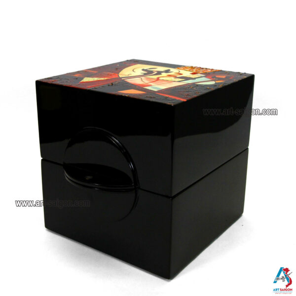 Joli coffret en forme de cube afin de ranger diverses choses à l’intérieur (bijoux, bagues, colliers, etc). Cette boîte est fabriquée en bois laqué et le dessin Art Moderne est peint à la main avec des incrustations de nacre et de petites coquilles d’œuf qui sont collées une par une. Une dizaine de couche de laque sont nécessaires à sa fabrication artisanale.