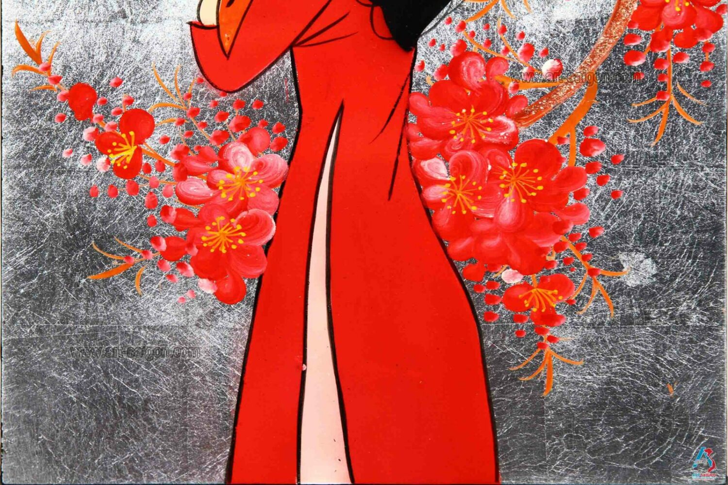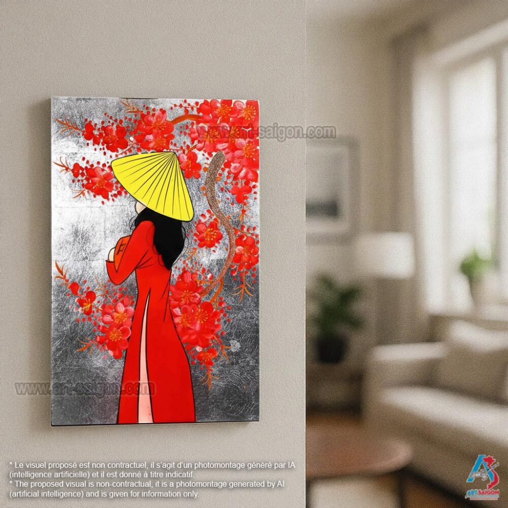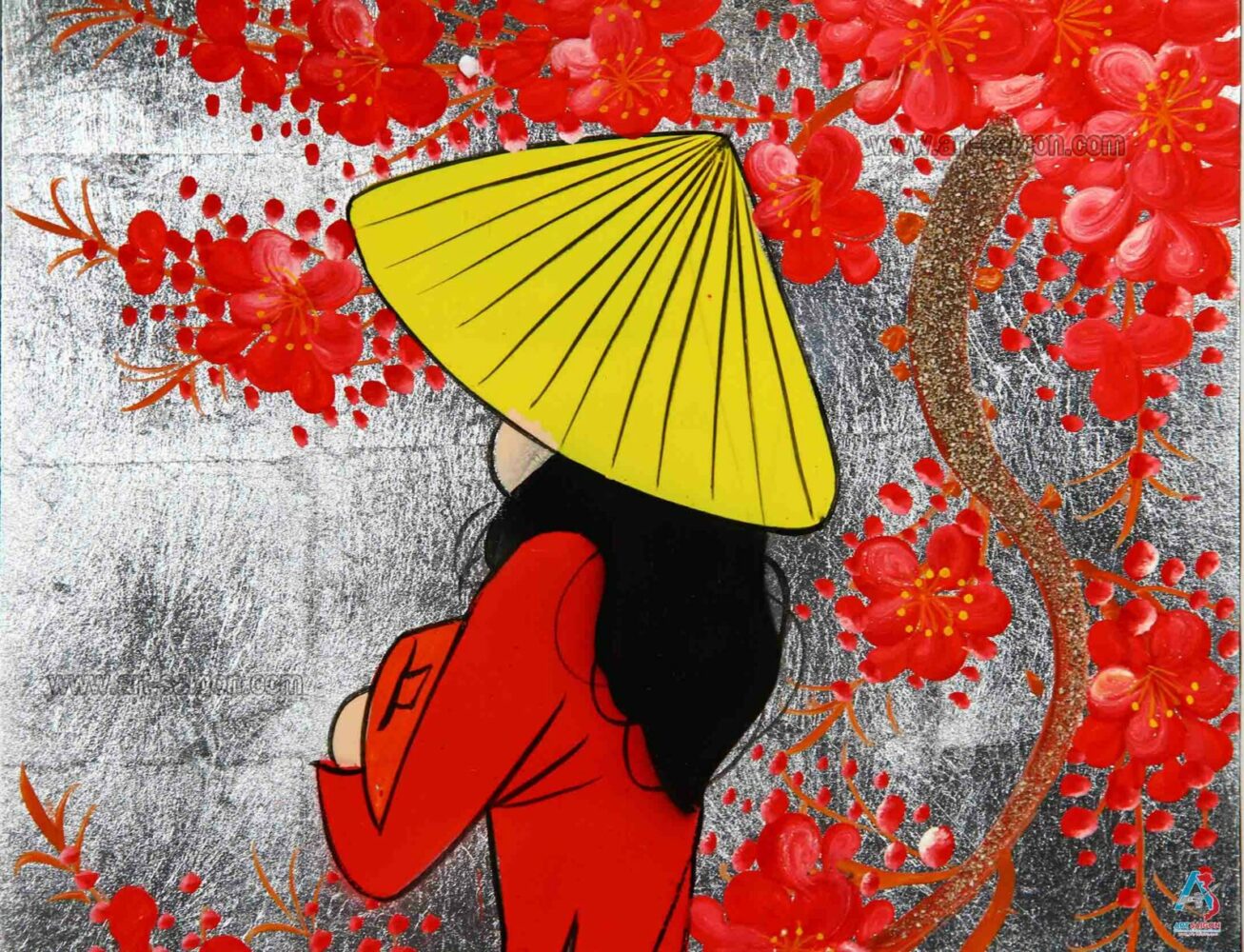 Ce joli tableau est fabriqué en bois laqué sur un fond de couleur argenté. Par ailleurs, il représente une femme vietnamienne. Aussi, elle est habillée de leur tunique traditionnelle « Áo dài » avec des fleurs de cerisier rouges qui sont peintes à la main. De plus, la branche de l’arbre est faite avec des petites coquilles d’œuf cassées qui sont collées une par une. Enfin, ce tableau est fait entièrement à la main avec des techniques traditionnelles d’autrefois.