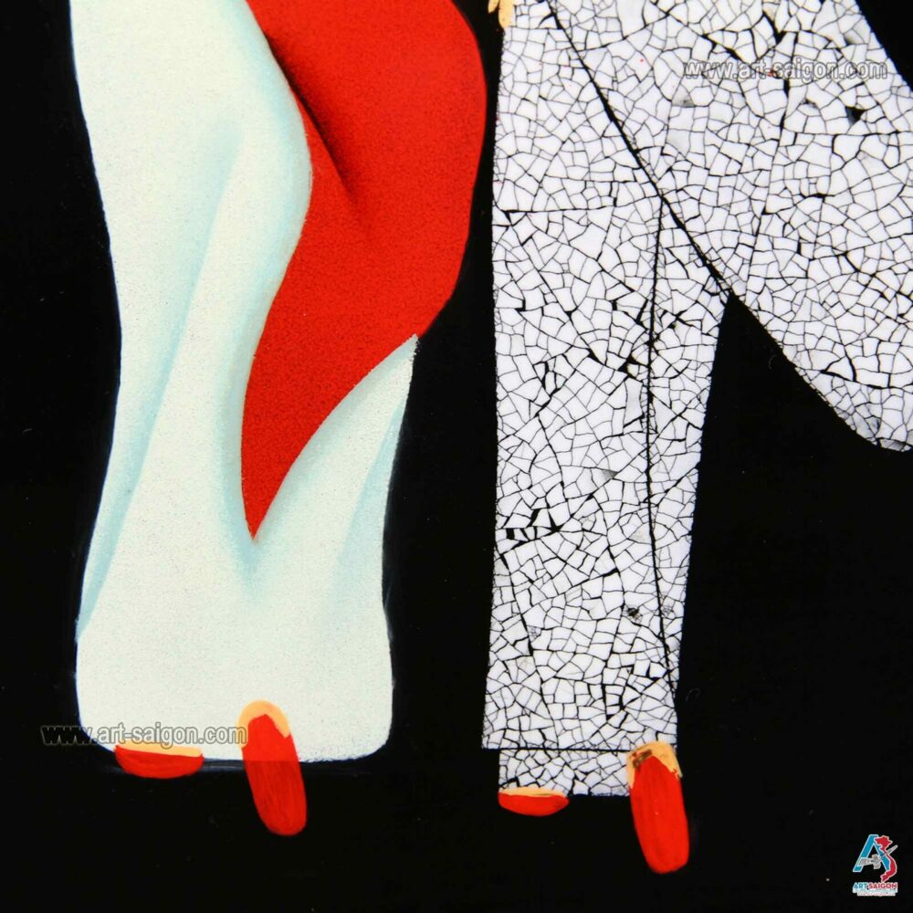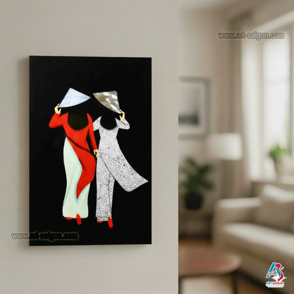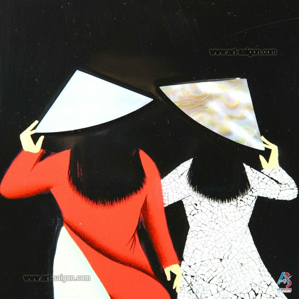 Ce joli tableau est fabriqué en bois laqué noir. Il représente deux femmes vietnamiennes. Par ailleurs, elles sont habillées de leur tunique traditionnelle « Áo dài » avec leur chapeau conique « Nón lá » fait avec de la nacre (coquillage). De plus, elle est fabriquée avec des petites coquilles d’œuf cassées qui sont collées une par une. Enfin, ce tableau est fait entièrement à la main avec des techniques traditionnelles d’autrefois.