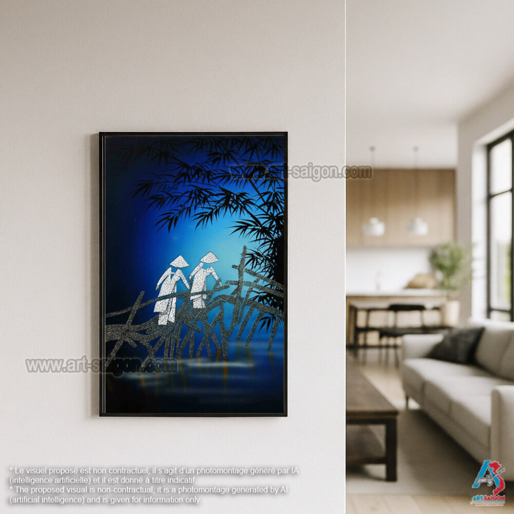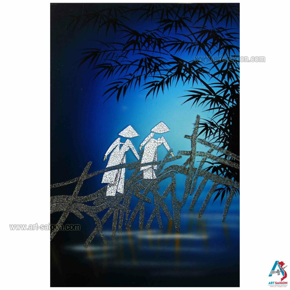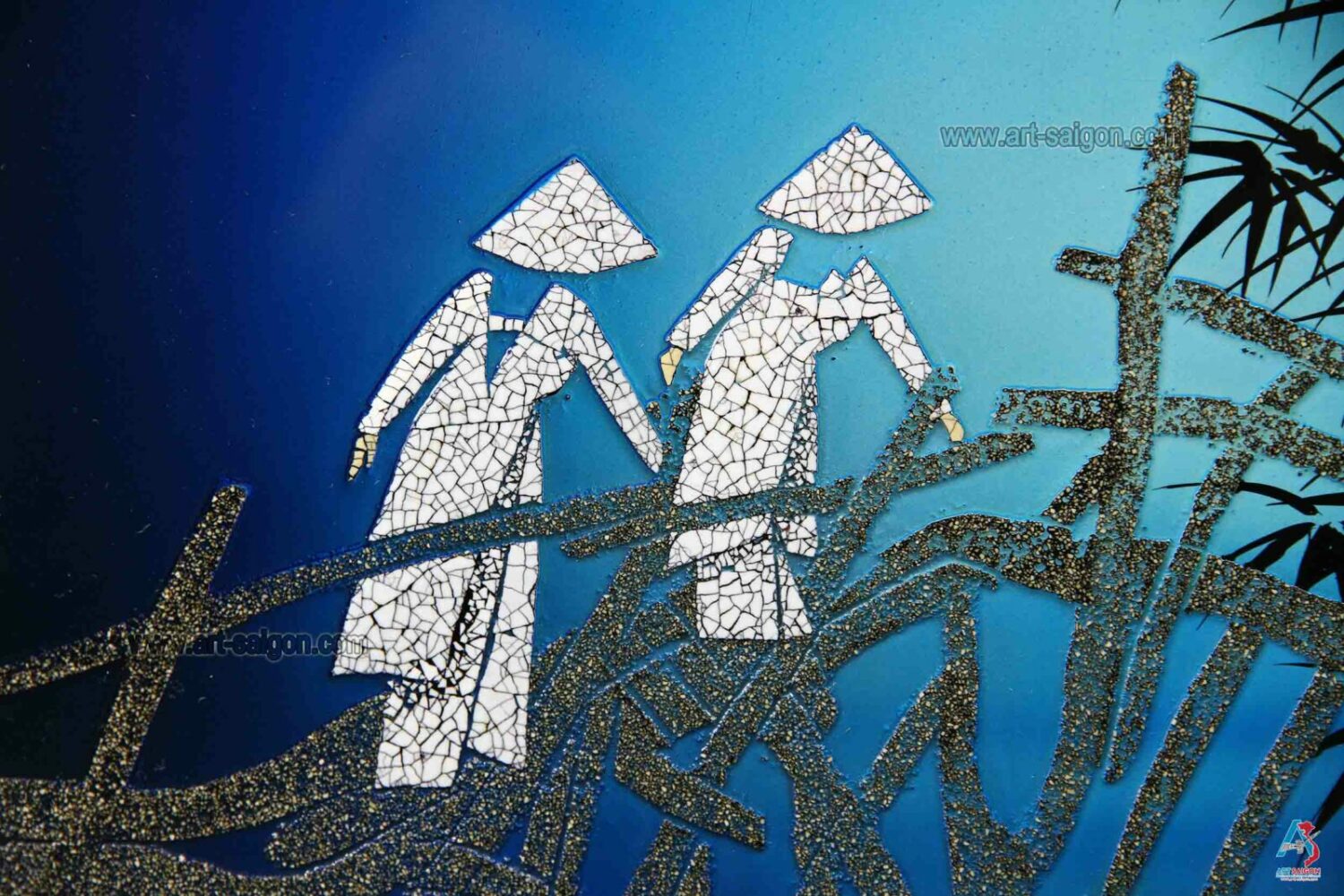 Ce joli tableau est fabriqué en bois laqué peint sur fond de couleur bleu. Il représente deux femmes vietnamiennes traversant un pont. Par ailleurs, elles sont habillées de leur tunique traditionnelle « Áo dài » avec leur chapeau conique « Nón lá ». De plus, elles sont fabriquées avec des petites coquilles d’œuf cassées qui sont collées une par une. Enfin, ce tableau est fait entièrement à la main avec des techniques traditionnelles d’autrefois.