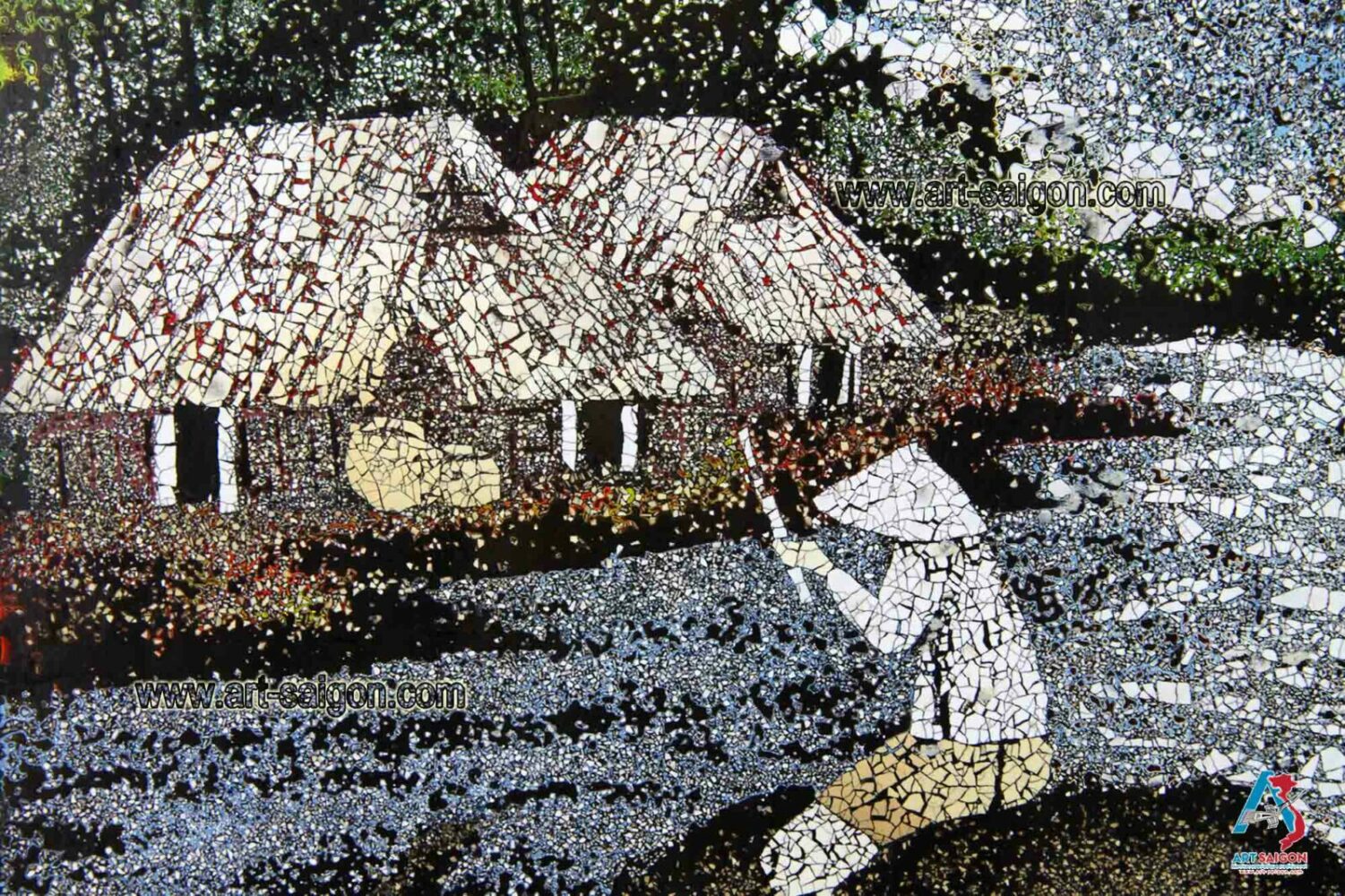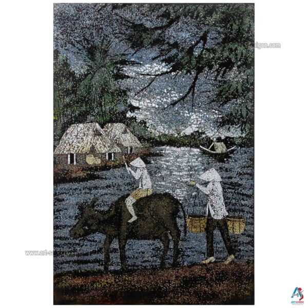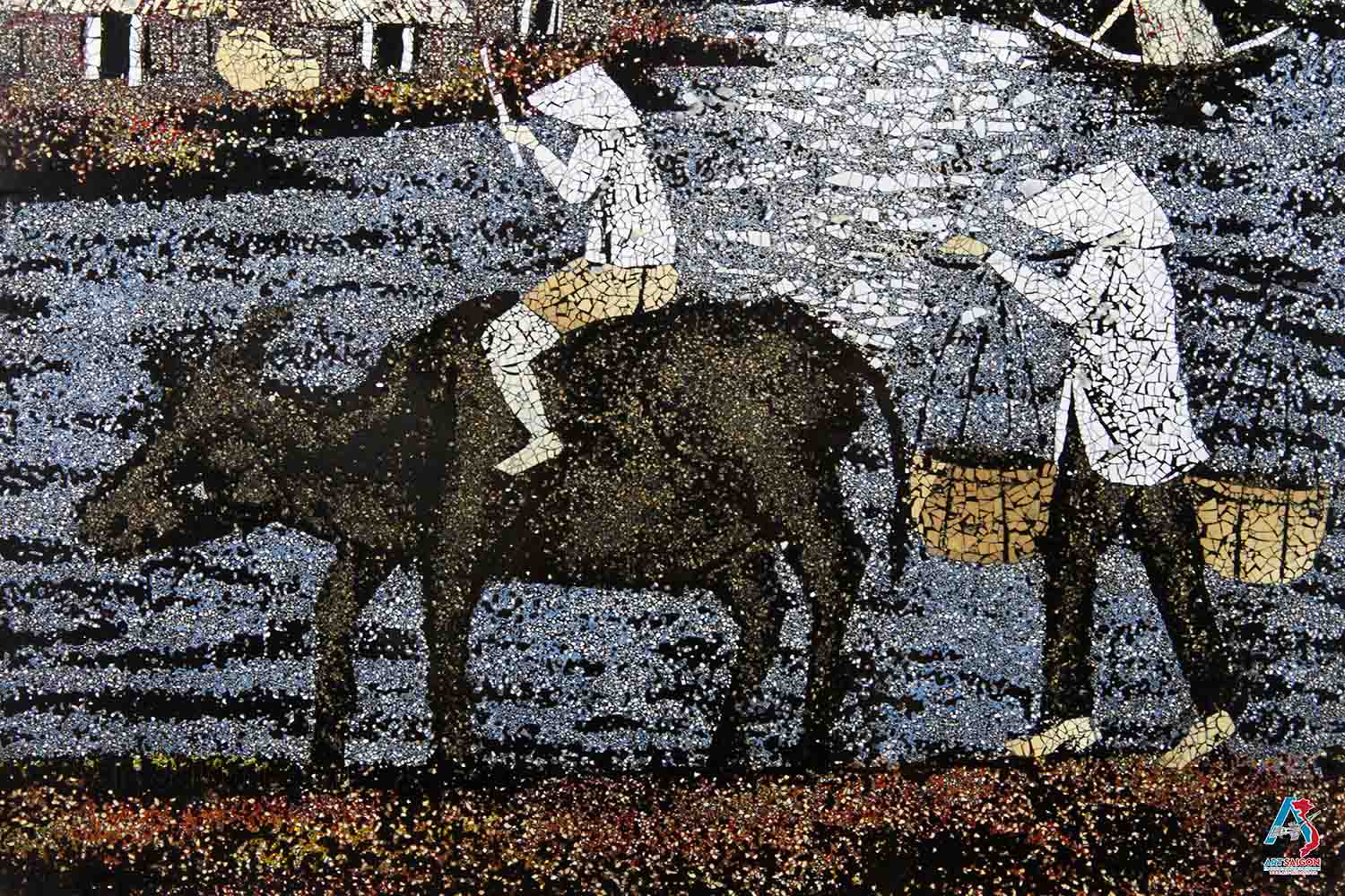 Ce joli tableau est fabriqué en bois laqué avec une couleur à dominante bleu foncé. Ainsi, il représente une scène de la campagne du Vietnam avec ses paysans et son paysage peint à la main. De plus, ce tableau est fait entièrement avec des petites coquilles d’œuf cassées qui sont collées une par une. Enfin, il est fait entièrement à la main avec des techniques traditionnelles d’autrefois.
