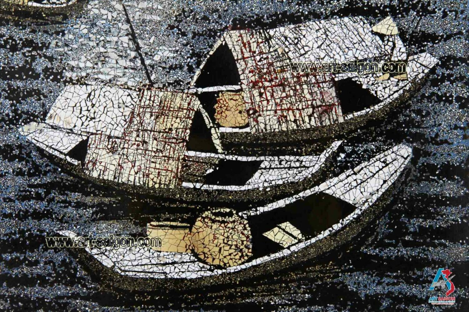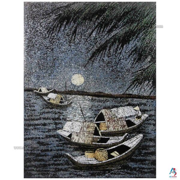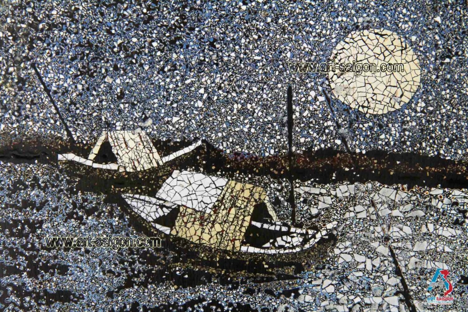 Ce joli tableau est fabriqué en bois laqué avec une couleur à dominante bleu foncé. Ainsi, il représente une scène de la campagne du Vietnam avec ses paysans et son paysage peint à la main. De plus, ce tableau est fait entièrement avec des petites coquilles d’œuf cassées qui sont collées une par une. Enfin, il est fait entièrement à la main avec des techniques traditionnelles d’autrefois.