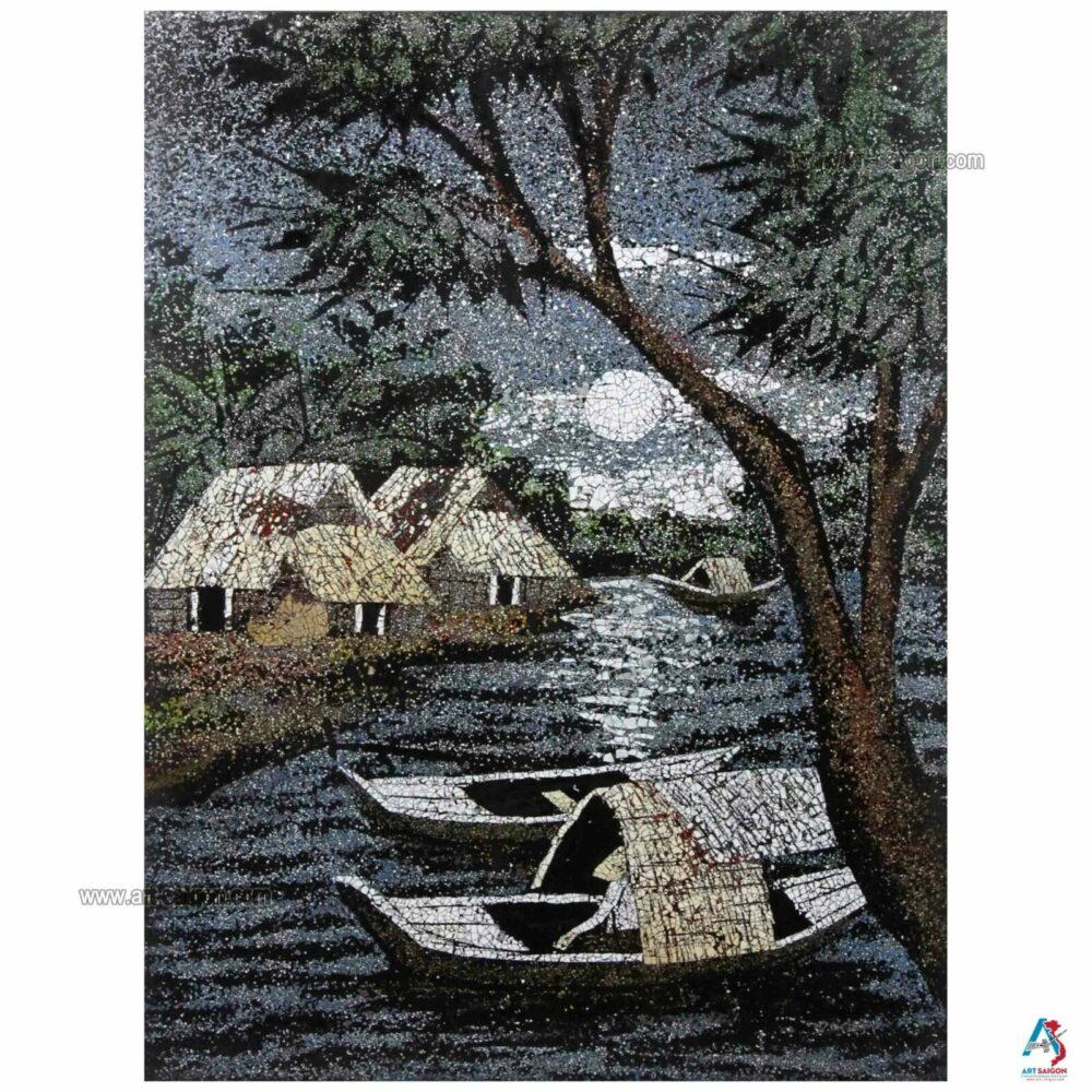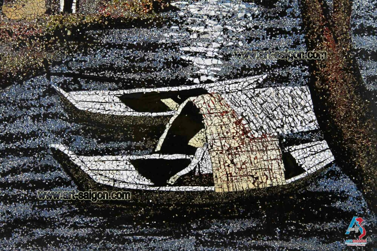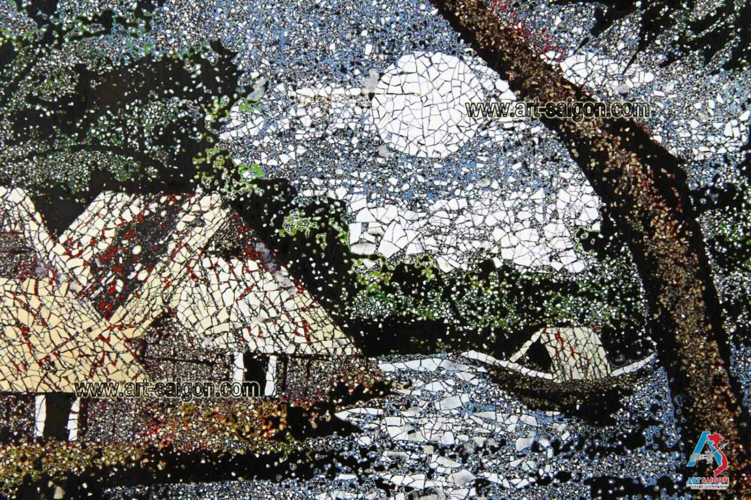 Ce joli tableau est fabriqué en bois laqué avec une couleur à dominante bleu foncé. Ainsi, il représente une scène de la campagne du Vietnam avec ses paysans et son paysage peint à la main. De plus, ce tableau est fait entièrement avec des petites coquilles d’œuf cassées qui sont collées une par une. Enfin, il est fait entièrement à la main avec des techniques traditionnelles d’autrefois.