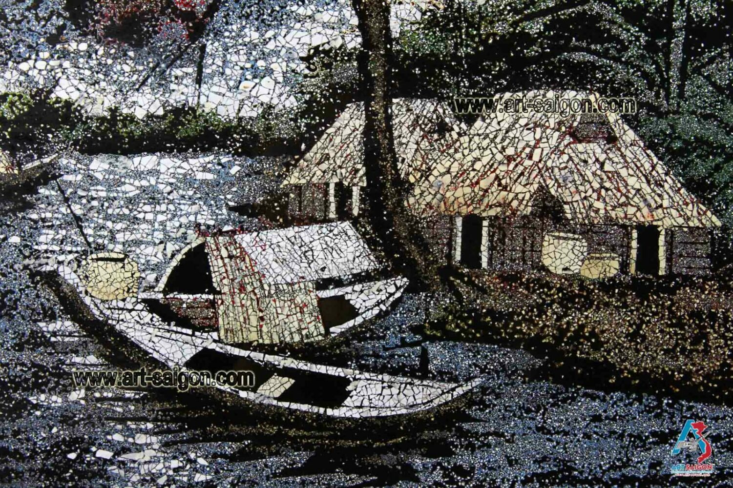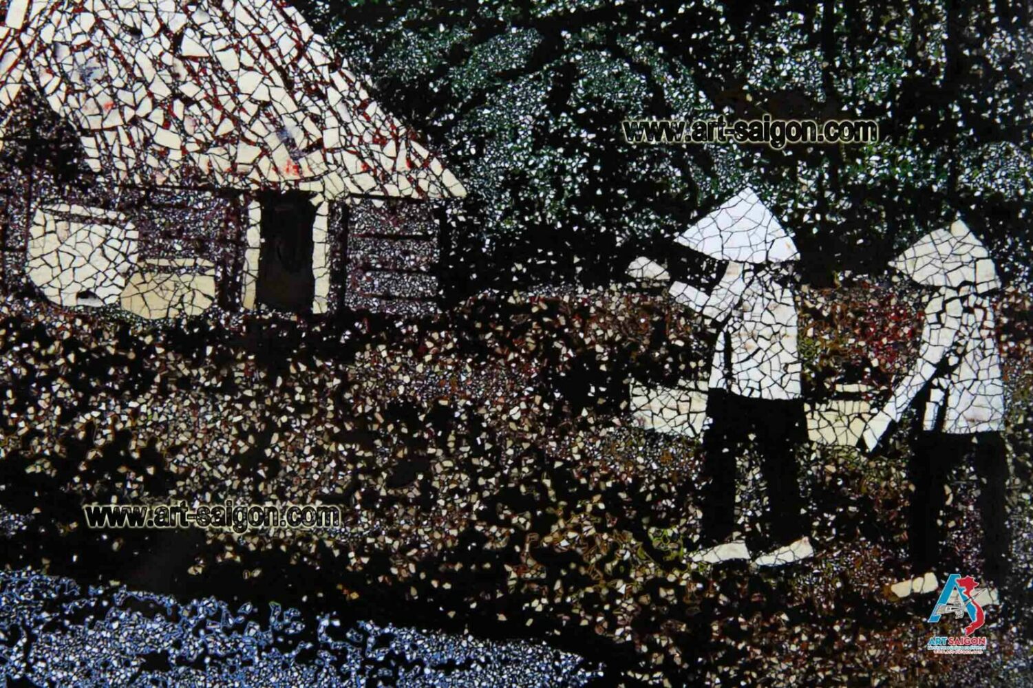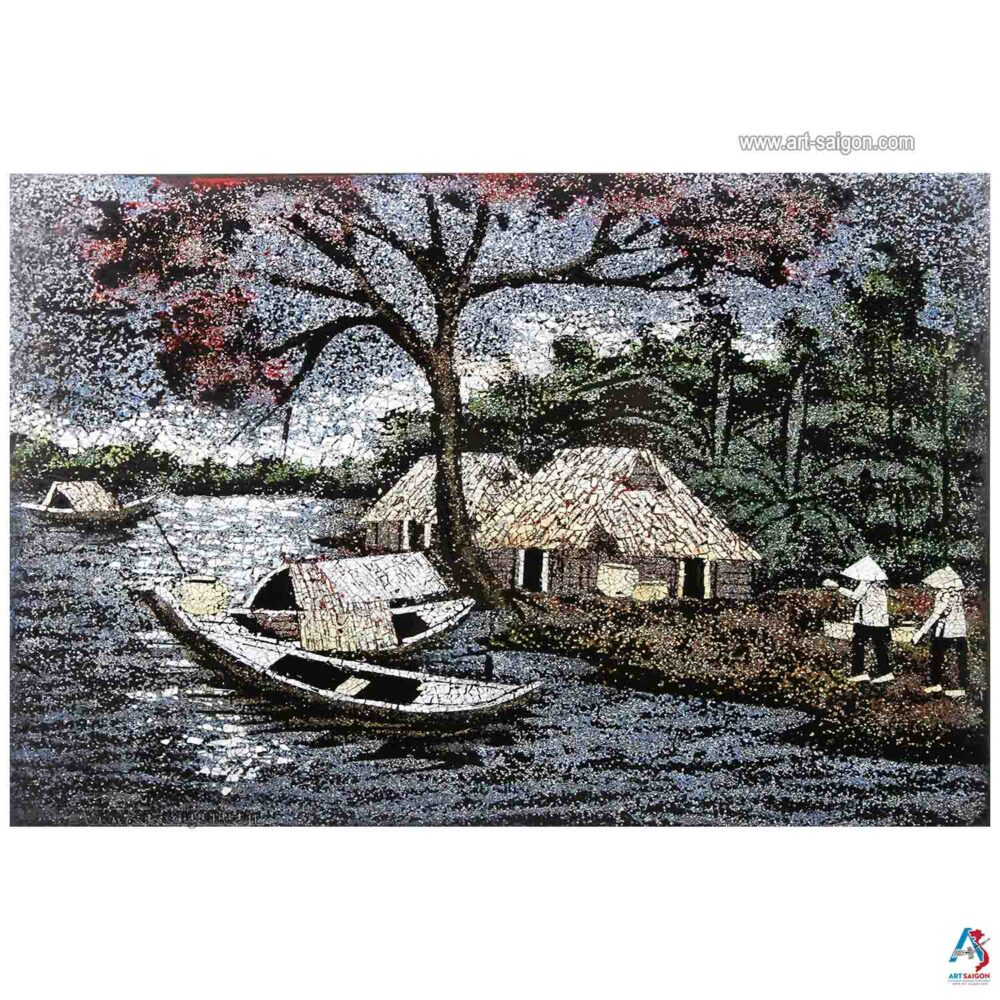 Ce joli tableau est fabriqué en bois laqué avec une couleur à dominante bleu foncé. Ainsi, il représente une scène de la campagne du Vietnam avec ses paysans et son paysage peint à la main. De plus, ce tableau est fait entièrement avec des petites coquilles d’œuf cassées qui sont collées une par une. Enfin, il est fait entièrement à la main avec des techniques traditionnelles d’autrefois.