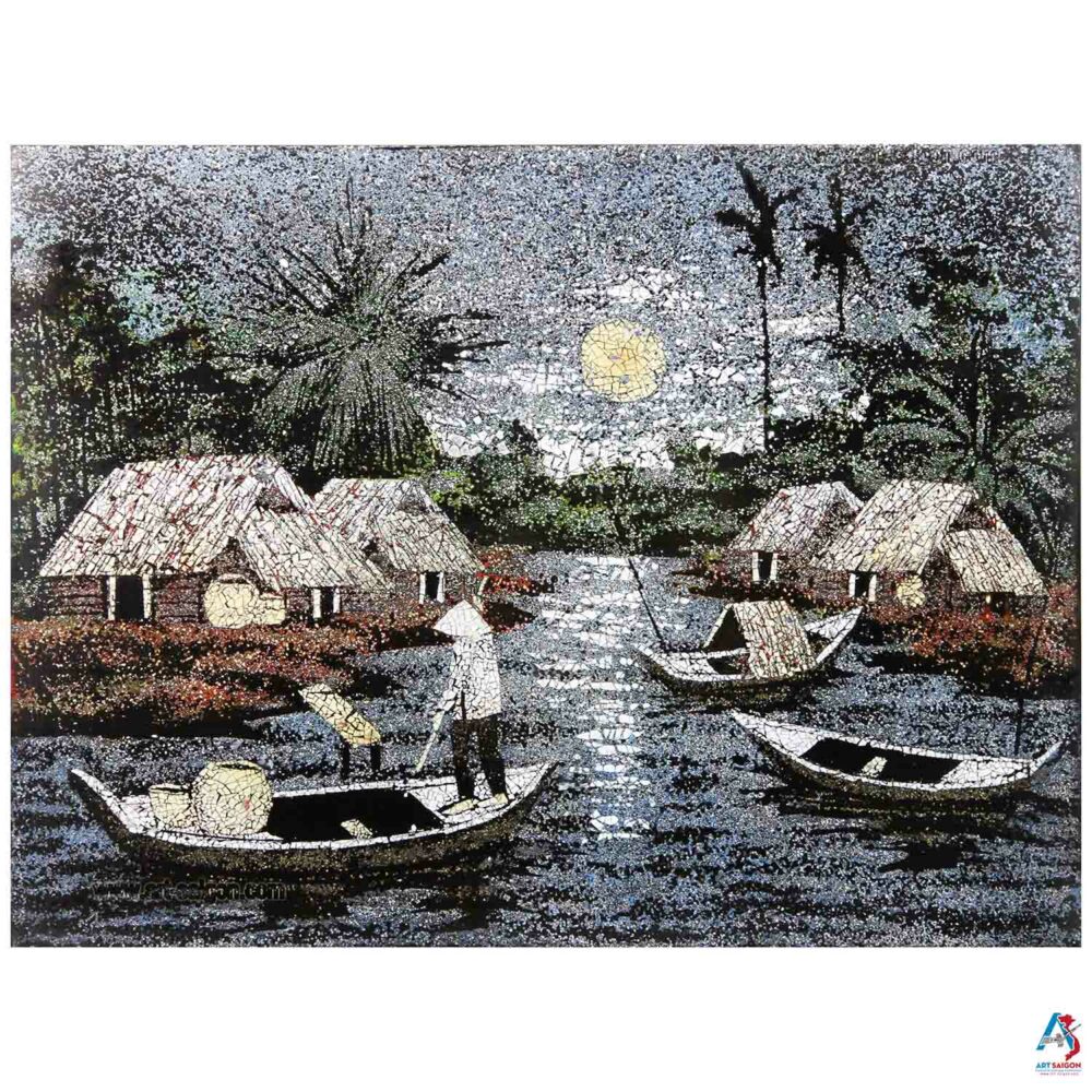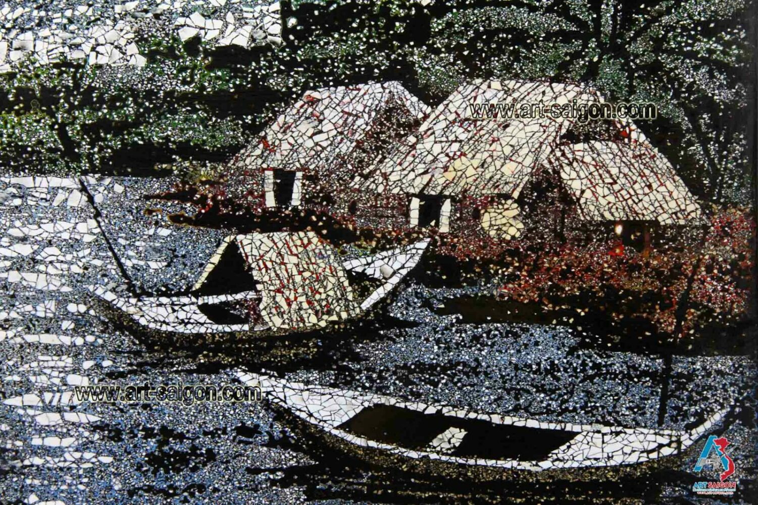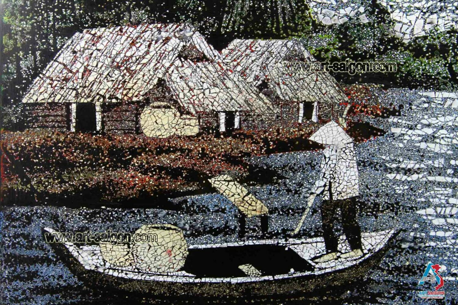Ce joli tableau est fabriqué en bois laqué avec une couleur à dominante bleu foncé. Ainsi, il représente une scène de la campagne du Vietnam avec ses paysans et son paysage peint à la main. De plus, ce tableau est fait entièrement avec des petites coquilles d’œuf cassées qui sont collées une par une. Enfin, il est fait entièrement à la main avec des techniques traditionnelles d’autrefois.