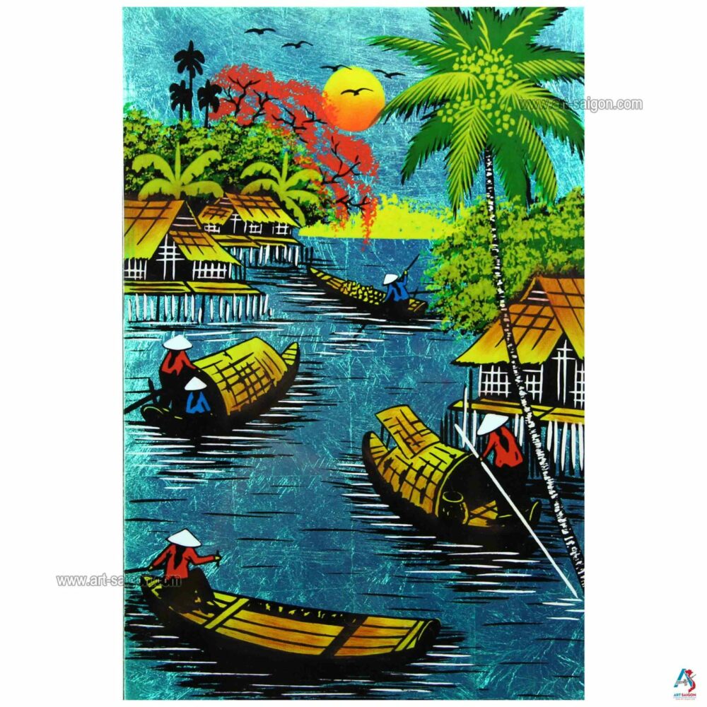 Ce joli tableau est fabriqué en bois laqué avec une couleur à dominante bleu. Ainsi, il représente une scène de la campagne du Vietnam avec ses paysans et son paysage peint à la main. Enfin, ce tableau est peint et entièrement fait à la main avec des techniques traditionnelles d’autrefois.
