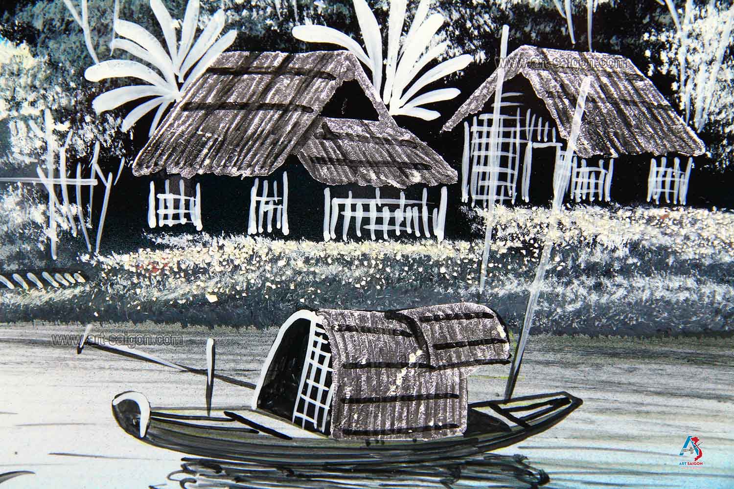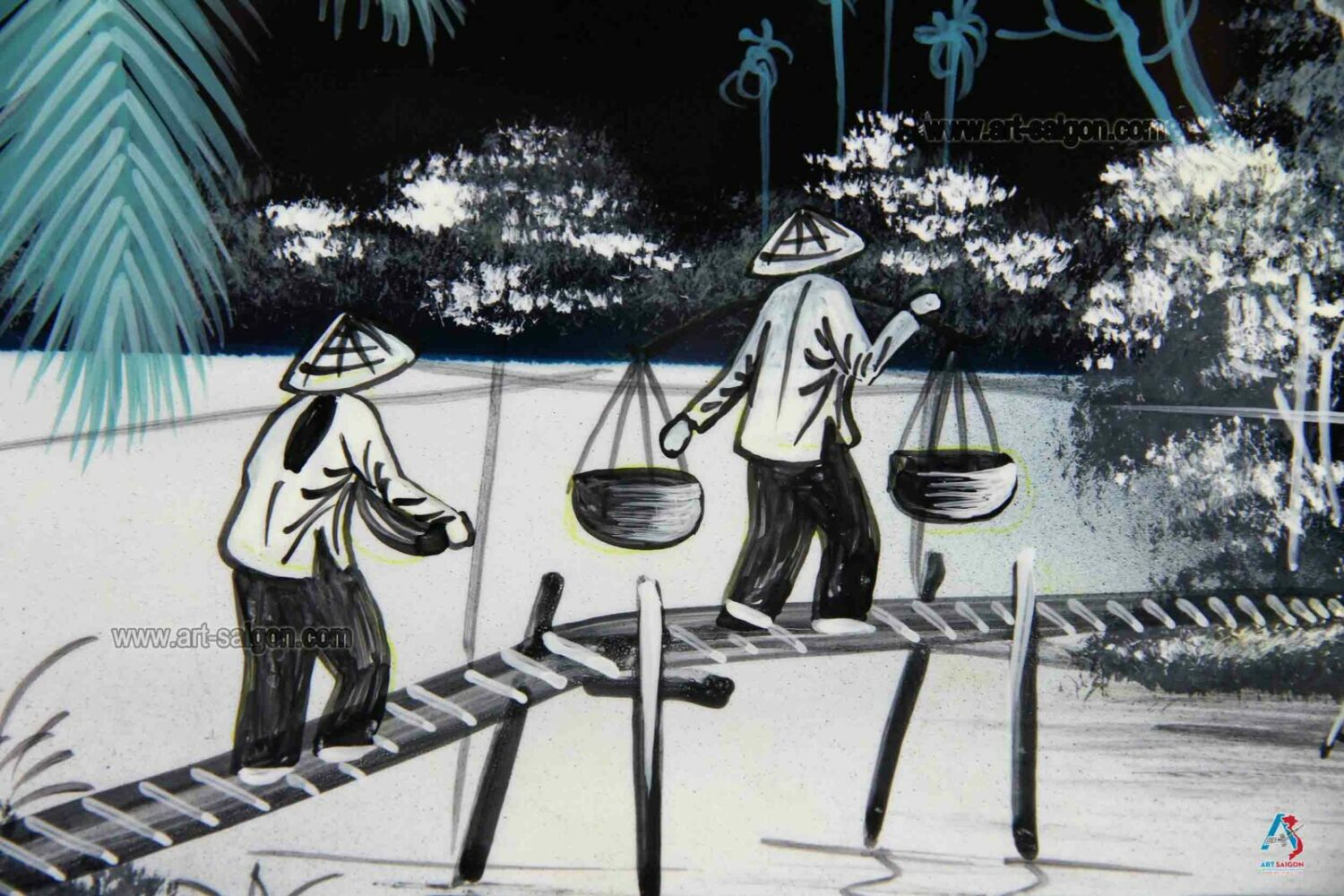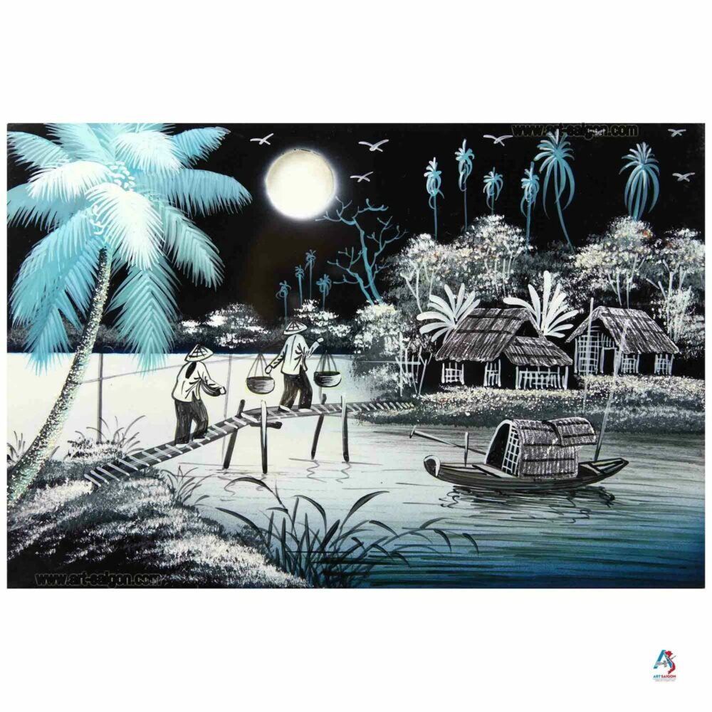 Ce joli tableau est fabriqué en bois laqué avec une couleur à dominante cyan. Ainsi, il représente une scène de la campagne du Vietnam avec ses paysans et son paysage peint à la main. Enfin, ce tableau est peint et entièrement fait à la main avec des techniques traditionnelles d’autrefois.