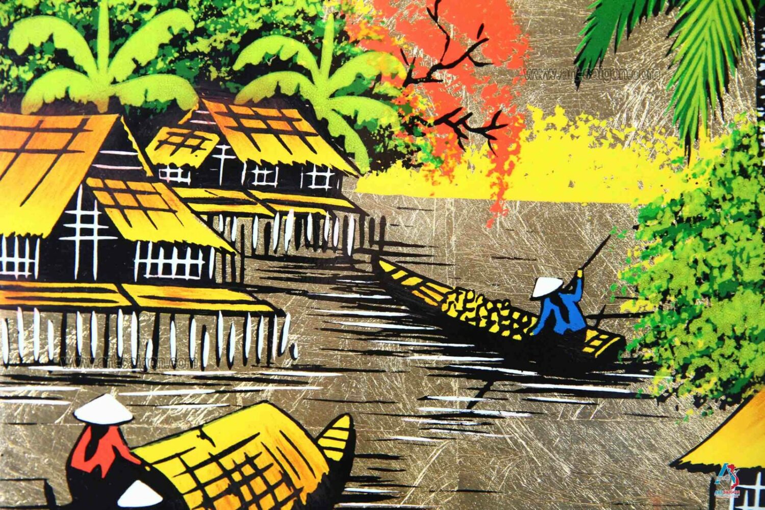 Ce joli tableau est fabriqué en bois laqué avec une couleur à dominante doré. Ainsi, il représente une scène de la campagne du Vietnam avec ses paysans et son paysage peint à la main. Enfin, ce tableau est peint et entièrement fait à la main avec des techniques traditionnelles d’autrefois.