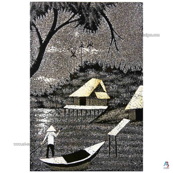 Ce joli tableau est fabriqué en bois laqué avec une couleur à dominante noir. Ainsi, il représente une scène de la campagne du Vietnam avec ses paysans et son paysage peint à la main. De plus, ce tableau est fait entièrement avec des petites coquilles d’œuf cassées qui sont collées une par une. Enfin, il est fait entièrement à la main avec des techniques traditionnelles d’autrefois.