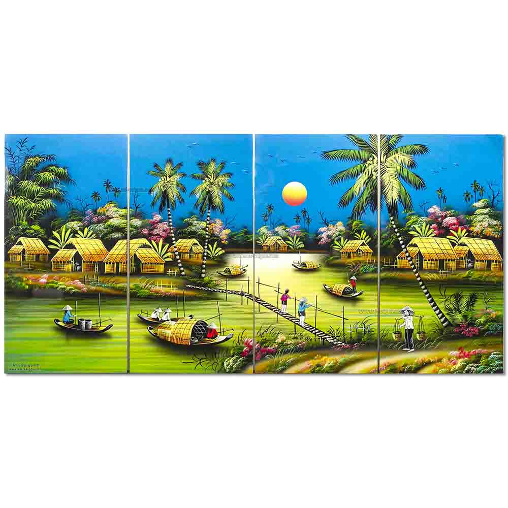 Cet ensemble de tableaux est composé de 4 panneaux. Ainsi, il représente une scène de la campagne du Vietnam avec ses paysans et son paysage peint à la main. De plus, il est fabriqué en bois laqué de couleur à dominante bleu. Par ailleurs, les toitures des maisons sont faites avec des fines feuilles dorées.