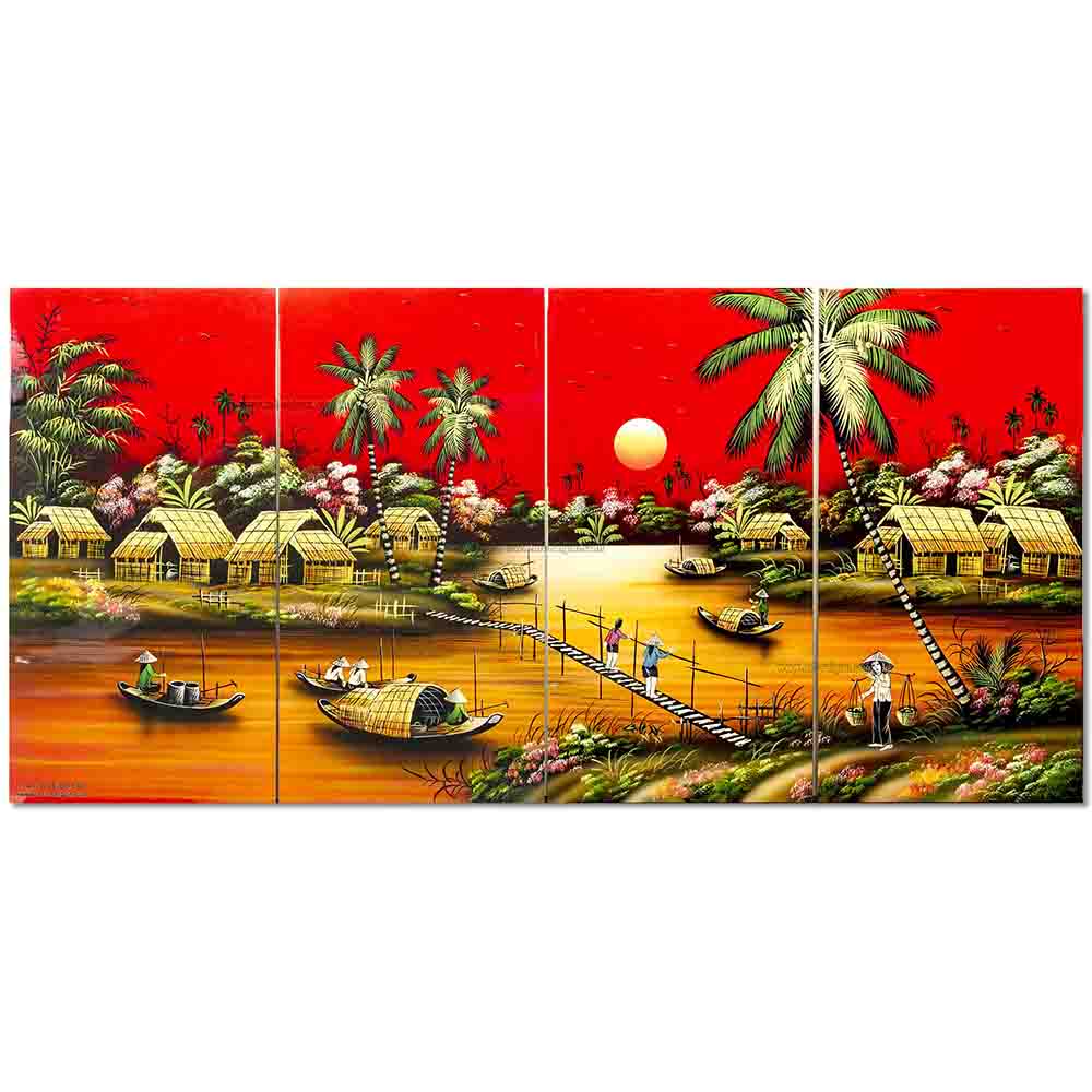 Cet ensemble de tableaux est composé de 4 panneaux. Ainsi, il représente une scène de la campagne du Vietnam avec ses paysans et son paysage peint à la main. De plus, il est fabriqué en bois laqué de couleur à dominante rouge. Par ailleurs, les toitures des maisons sont faites avec des fines feuilles dorées.