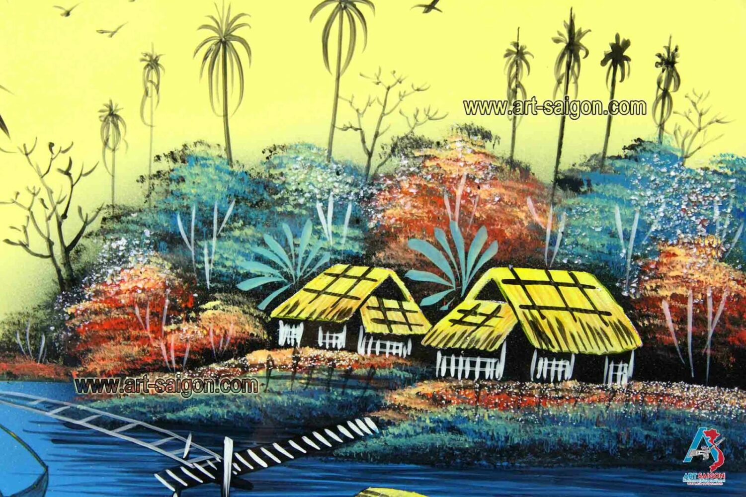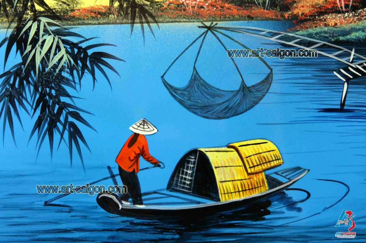 Joli tableau artisanal fabriquait en bois laqué. Il représente une scène de la campagne du Vietnam avec ses paysans et son paysage peint sur un fond bleu et jaune. De plus, le tableau est fait également avec des petites coquilles d’œuf cassées qui sont collées une par une. Enfin, il est fait entièrement à la main avec des techniques traditionnelles d’autrefois.