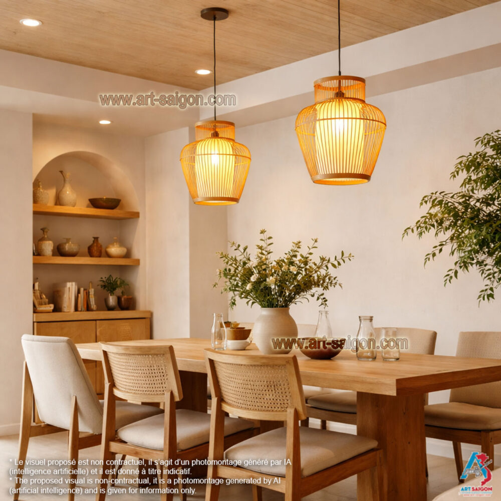 Bien que fabriqué au Vietnam, chaque lampion en bambou asiatique séduit aussi les amateurs de lanternes chinoises ou asiatiques. Son design authentique s’intègre facilement dans une décoration moderne ou traditionnelle : cuisine, îlot central, salle à manger, salon, chambre, loft, café, ferme, boutique ou club.