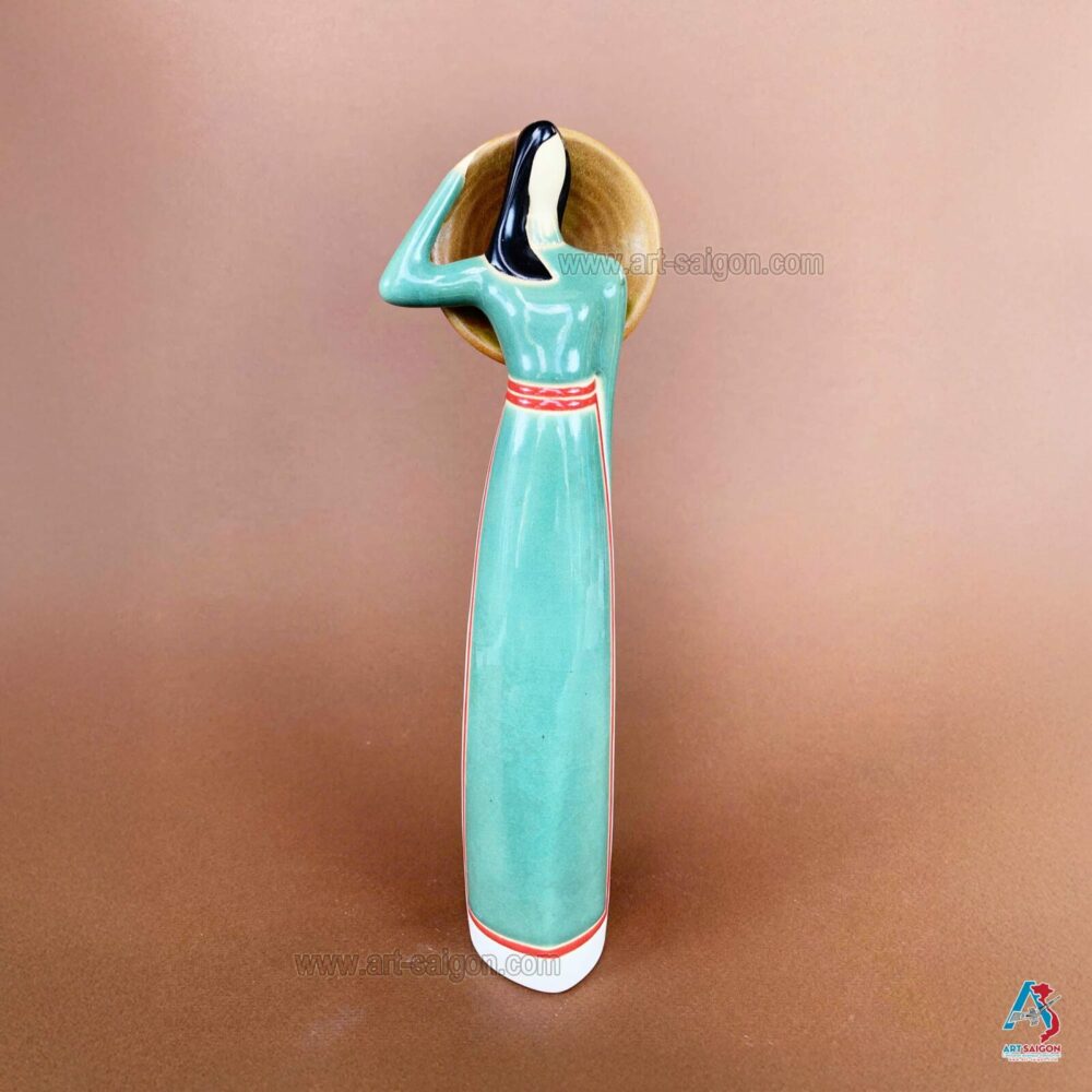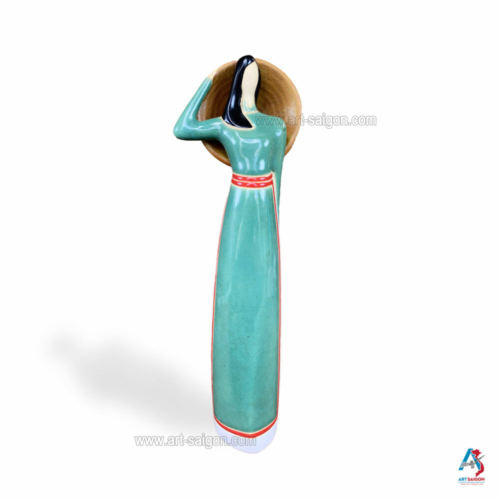 Cette statuette en terre cuite représente une jeune femme du Sud du Vietnam, vêtue d’un “áo dài” traditionnel du “Nam Bộ” en vert clair. Dans sa main, elle tient un “nón lá“, symbole de la vie rurale et de l’élégance simple des femmes du delta du Mékong.