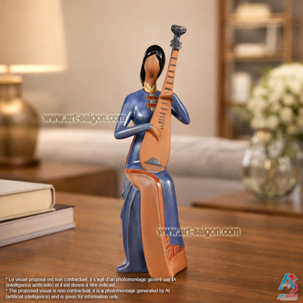 Cette statuette en terre cuite montre une jeune femme assise jouant du đàn “tỳ bà“, un luth traditionnel vietnamien à quatre cordes, reconnaissable à sa caisse en forme de poire et à son jeu expressif. Habillée d’un “áo dài” raffiné, elle incarne l’harmonie entre beauté et art musical.
