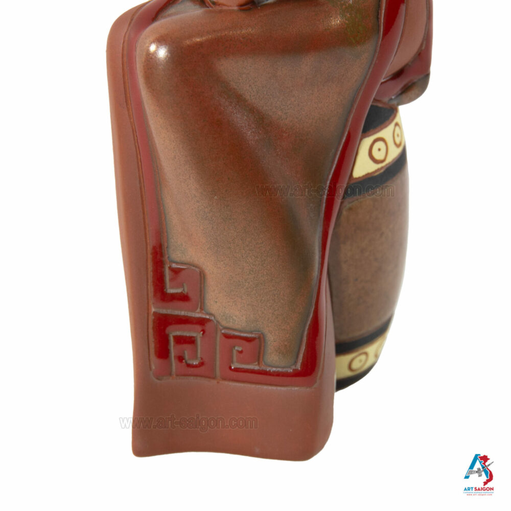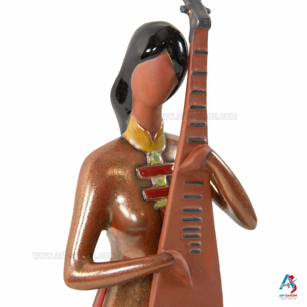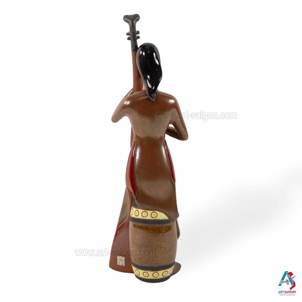 Cette statuette en terre cuite montre une jeune femme assise jouant du đàn “tỳ bà“, un luth traditionnel vietnamien à quatre cordes, reconnaissable à sa caisse en forme de poire et à son jeu expressif. Habillée d’un “áo dài” raffiné, elle incarne l’harmonie entre beauté et art musical.