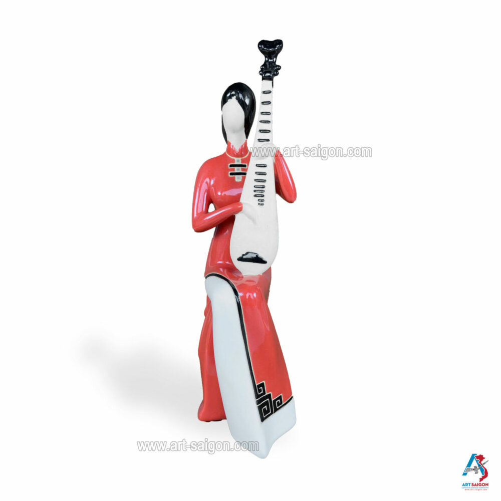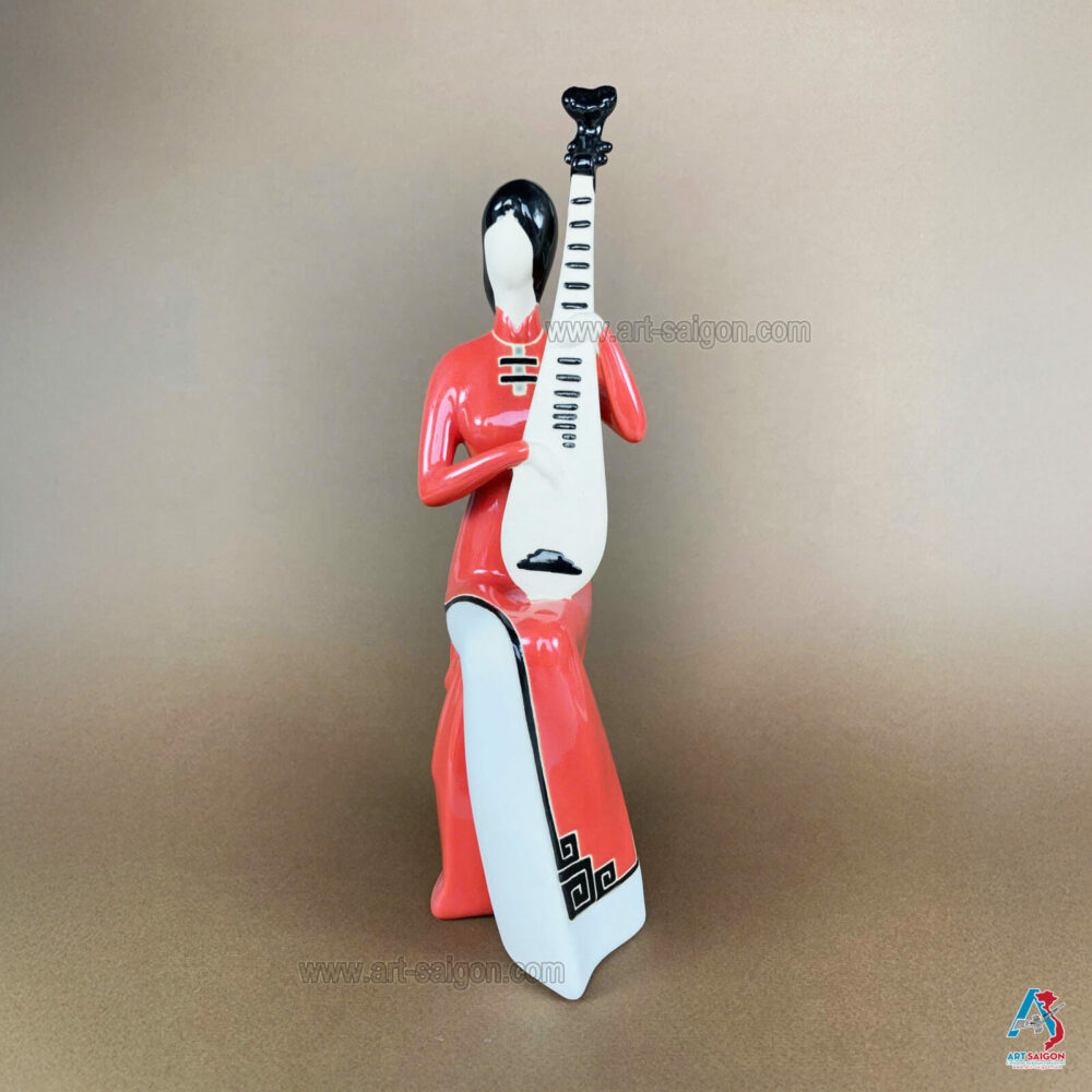 Cette statuette en terre cuite montre une jeune femme assise jouant du đàn “tỳ bà“, un luth traditionnel vietnamien à quatre cordes, reconnaissable à sa caisse en forme de poire et à son jeu expressif. Habillée d’un “áo dài” rouge raffiné, elle incarne l’harmonie entre beauté et art musical.