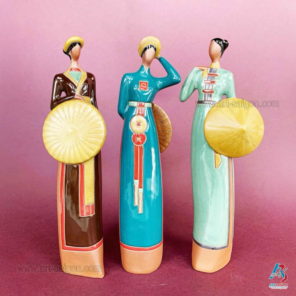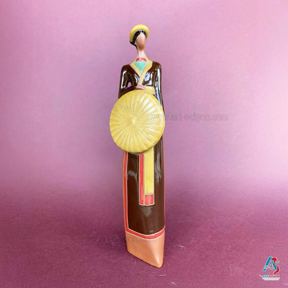 Cette statuette en terre cuite représente une jeune femme du Nord du Vietnam, vêtue d’un “áo tứ thân” traditionnel. Dans sa main, elle tient un “nón quai thao“, le célèbre chapeau plat à larges bordures, symbole des anciennes fêtes villageoises et des danses folkloriques du delta du fleuve Rouge.