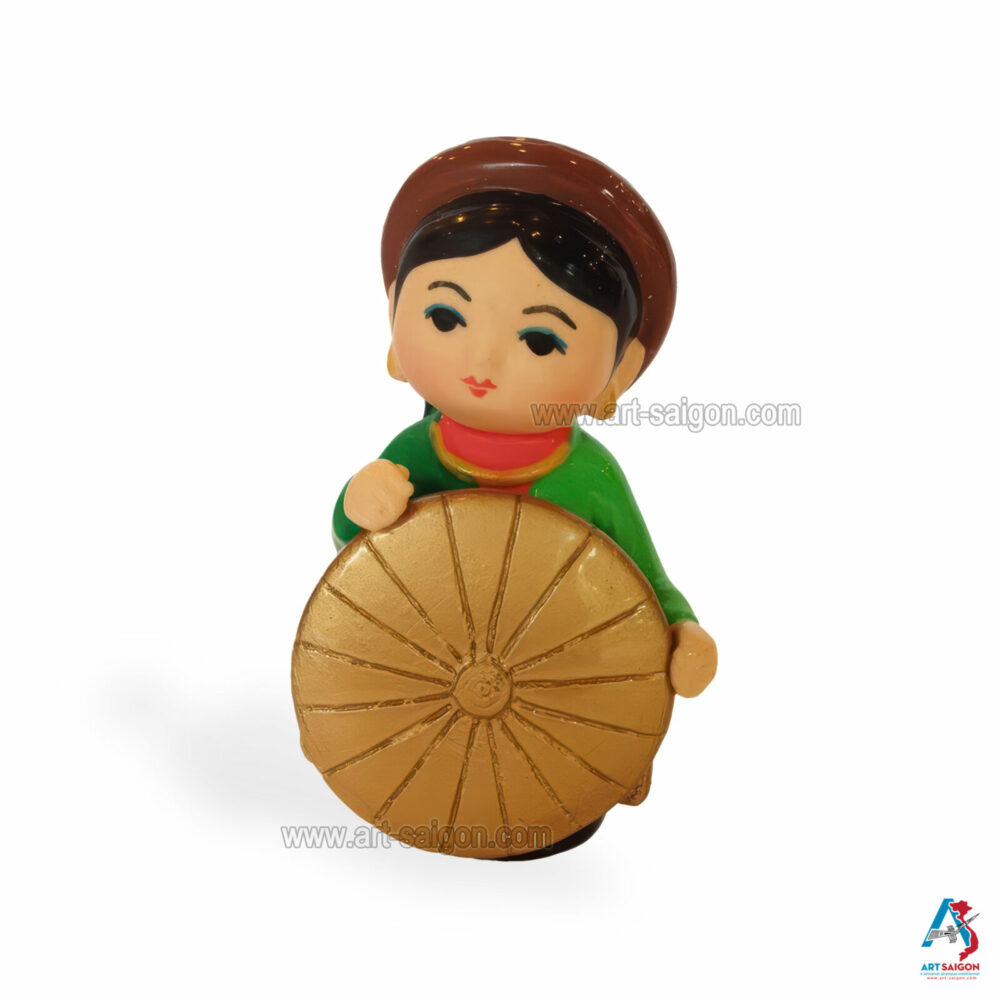 Cette statuette en terre cuite représente une jeune femme du Nord du Vietnam, vêtue d’un “áo tứ thân” traditionnel. Dans sa main, elle tient un “nón quai thao“, le célèbre chapeau plat à larges bordures, symbole des anciennes fêtes villageoises et des danses folkloriques du delta du fleuve Rouge.