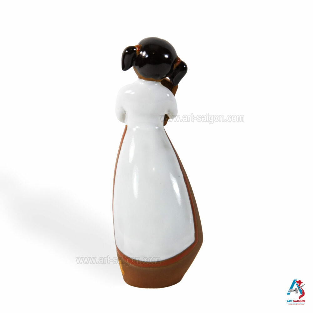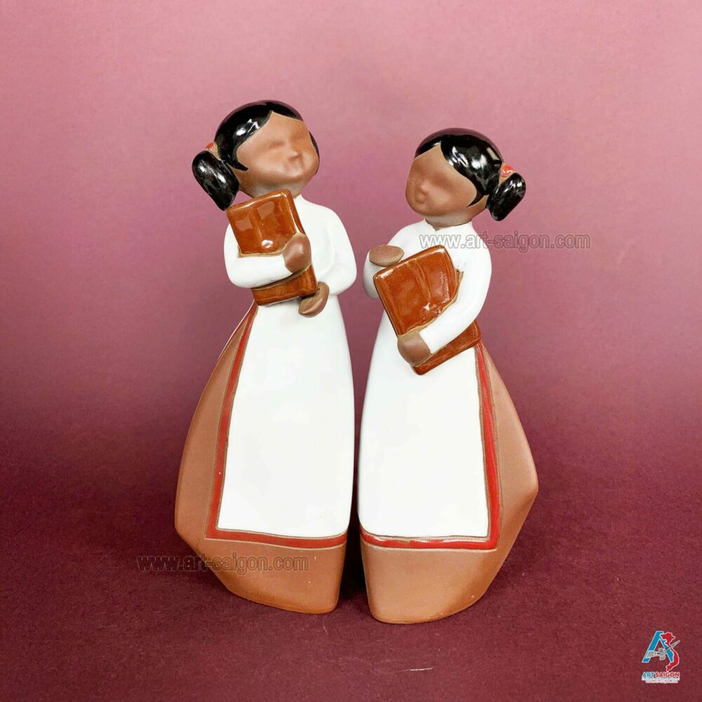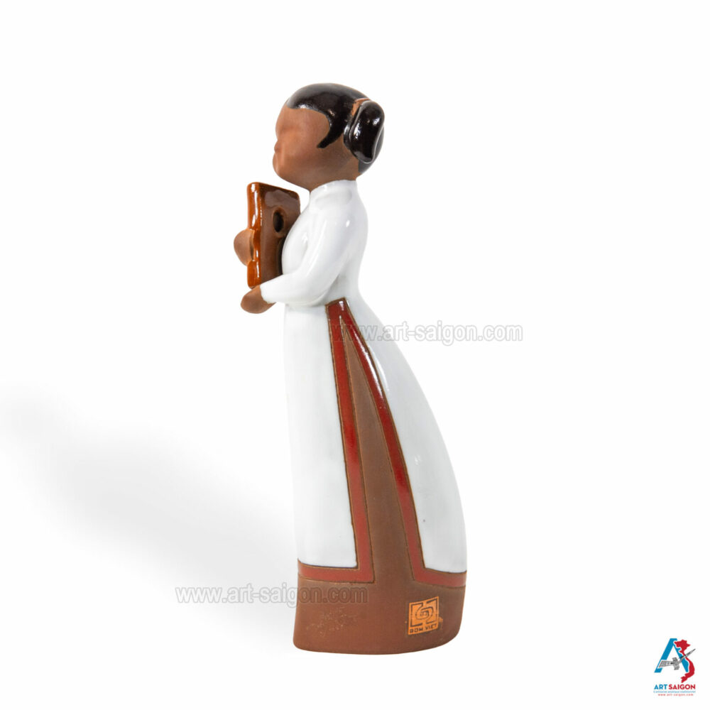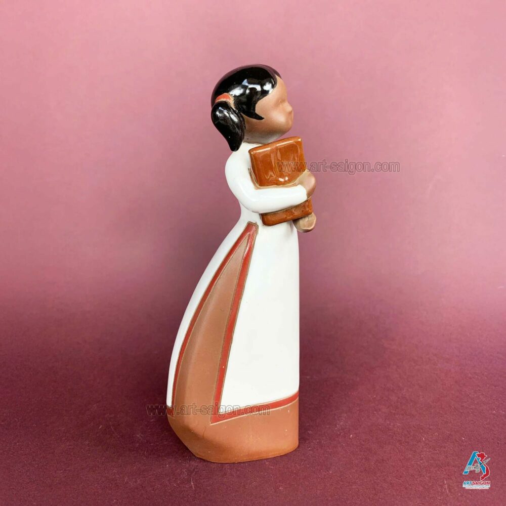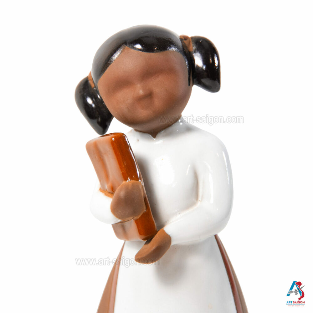 Cette statuette en terre cuite représente une petite fille en route pour l’école, vêtue d’un “áo dài” blanc. Elle tient son cartable dans les bras et avance en sautillant avec insouciance, exprimant la joie et l’enthousiasme de l’enfance.