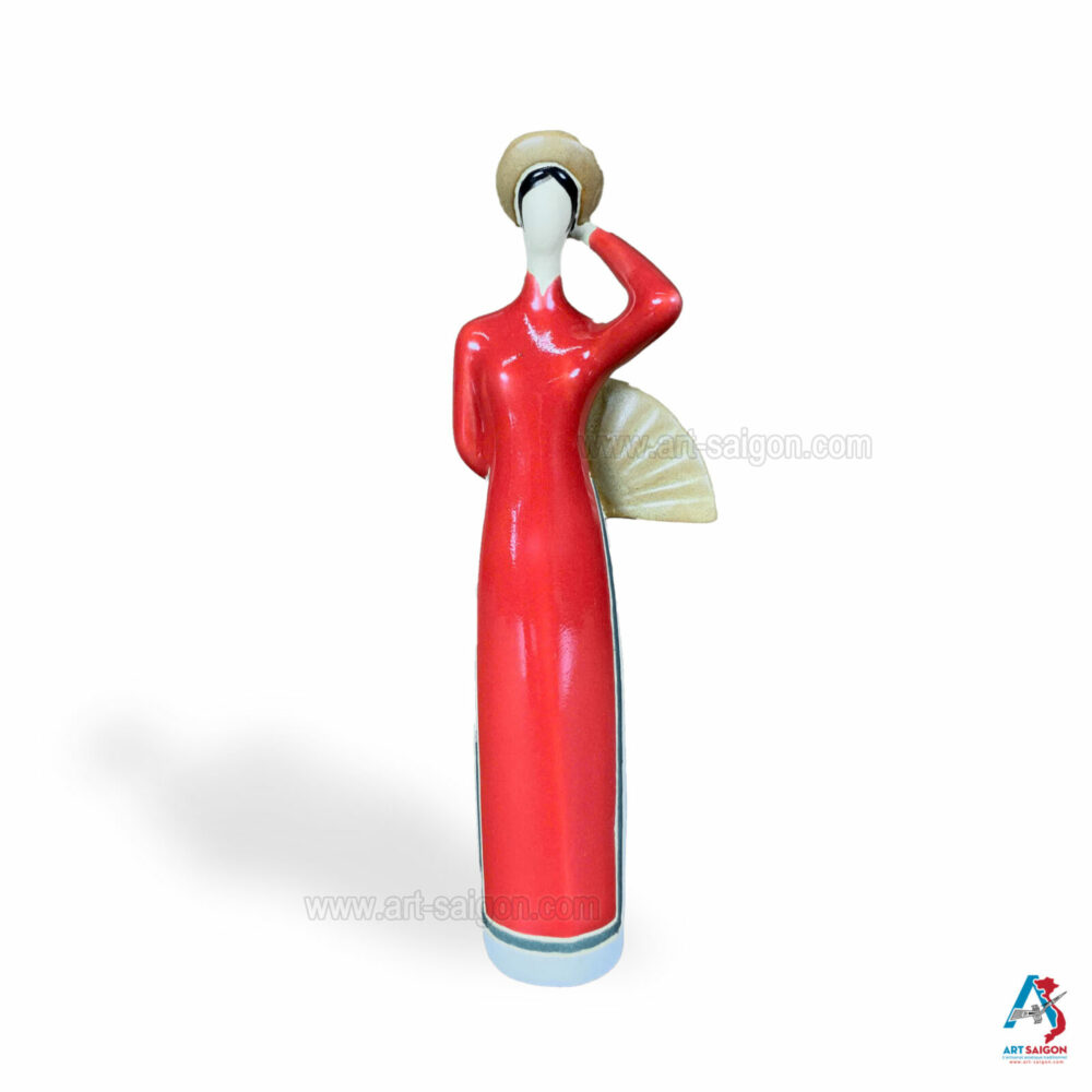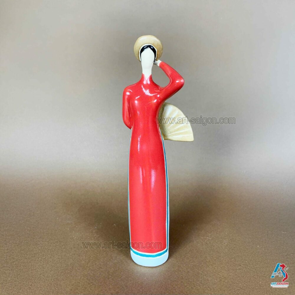 Cette statuette en terre cuite représente une jeune femme du Centre du Vietnam, vêtue d’un “áo dài” traditionnel en rouge. Dans sa main, elle tient un éventail, accessoire raffiné symbolisant la grâce et l’élégance des femmes vietnamiennes.