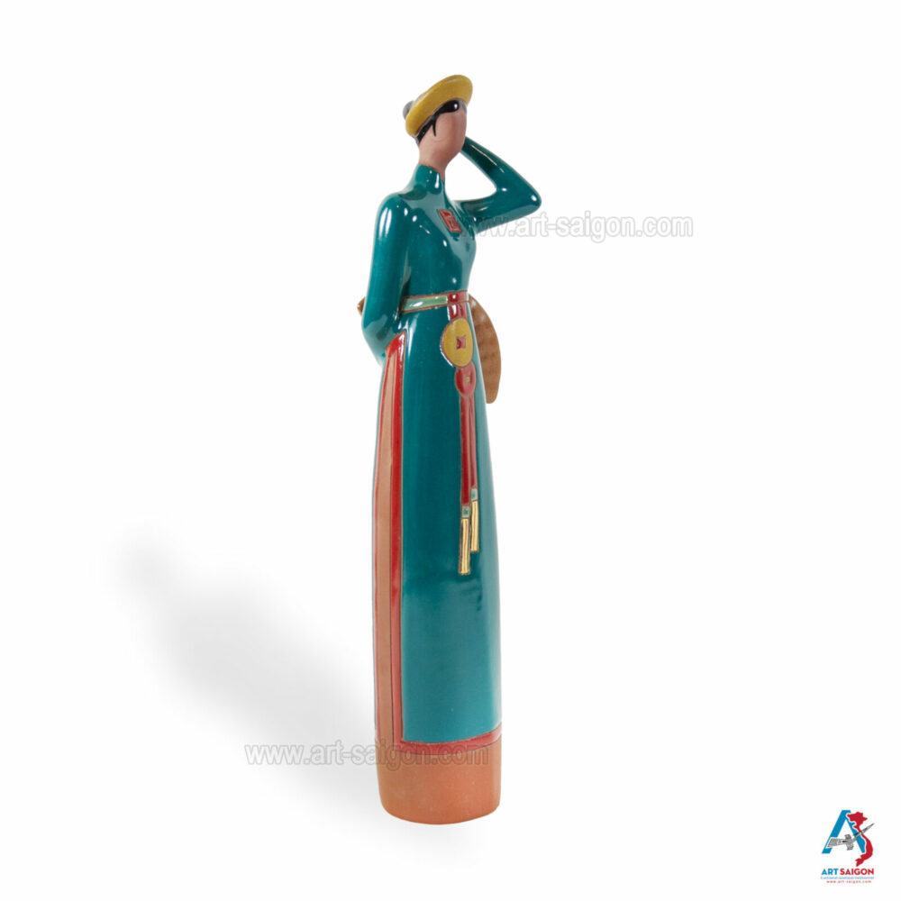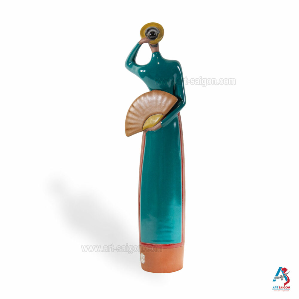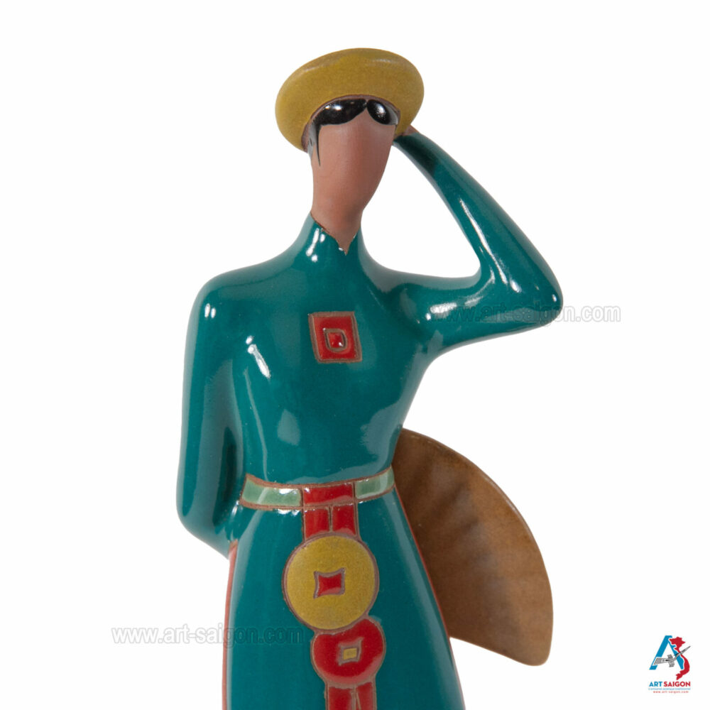 Cette statuette en terre cuite représente une jeune femme du Centre du Vietnam, vêtue d’un “áo dài” traditionnel. Dans sa main, elle tient un éventail, accessoire raffiné symbolisant la grâce et l’élégance des femmes vietnamiennes.
