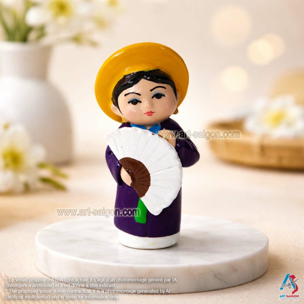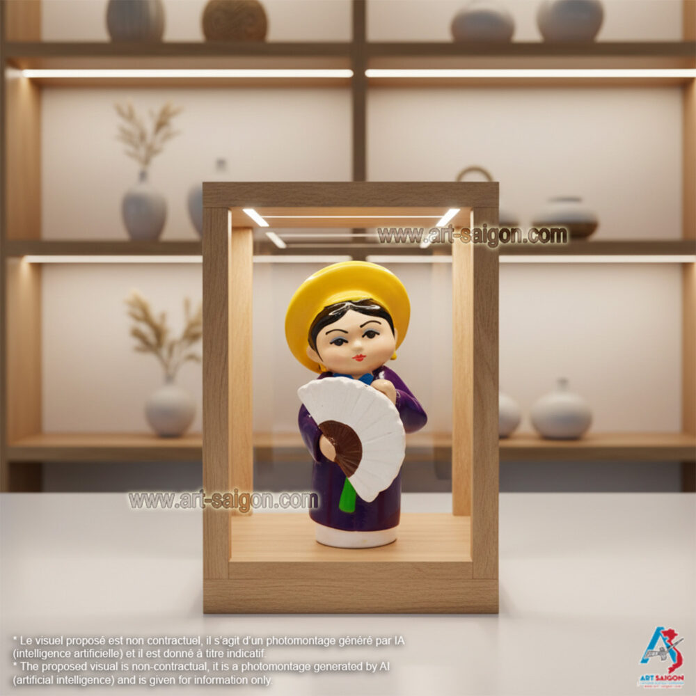 Cette statuette en terre cuite représente une jeune femme du Centre du Vietnam, vêtue d’un “áo dài” traditionnel. Dans sa main, elle tient un éventail, accessoire raffiné symbolisant la grâce et l’élégance des femmes vietnamiennes.