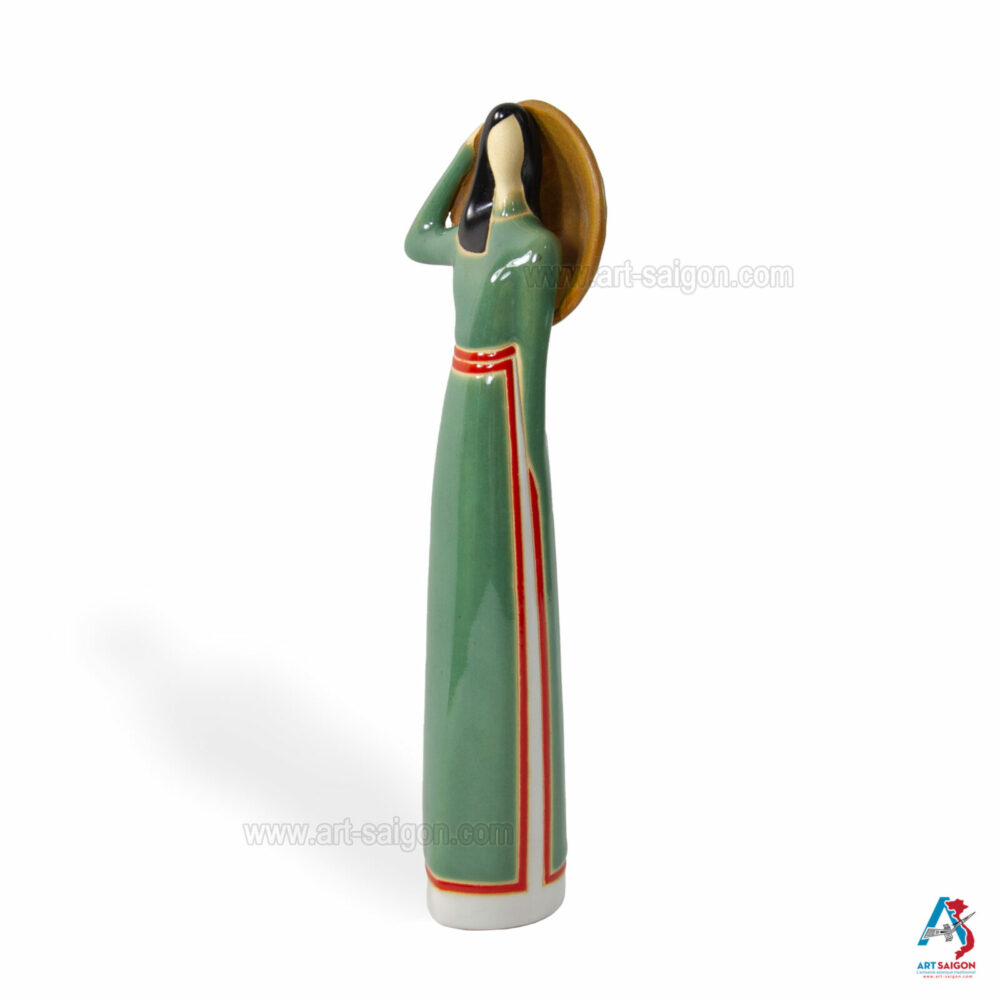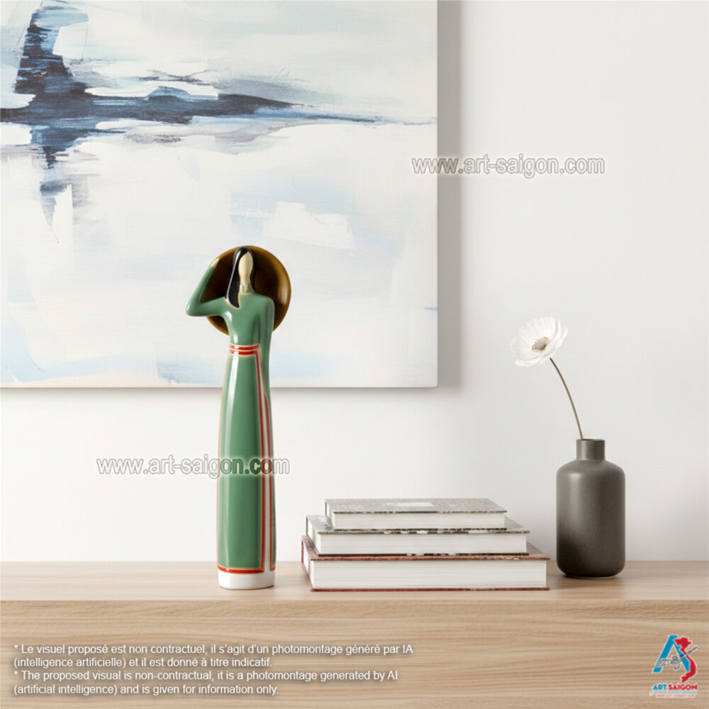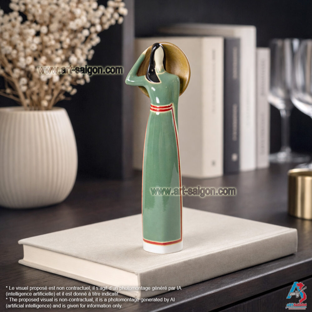 Cette statuette en terre cuite représente une jeune femme du Sud du Vietnam, vêtue d’un “áo dài” traditionnel du “Nam Bộ” en vert clair. Dans sa main, elle tient un “nón lá“, symbole de la vie rurale et de l’élégance simple des femmes du delta du Mékong.