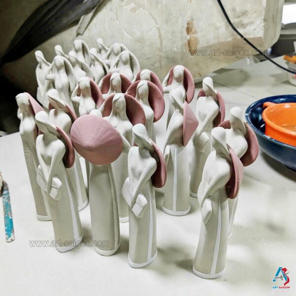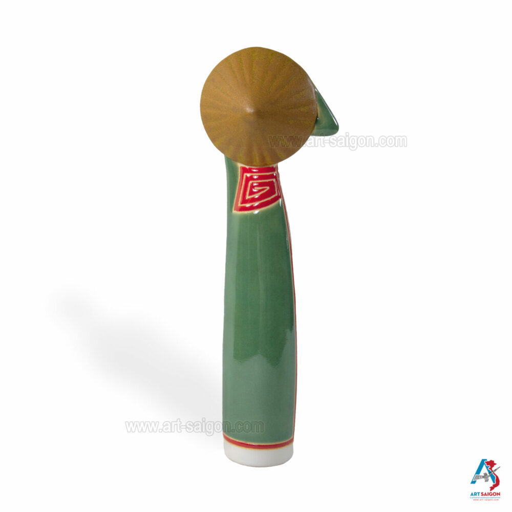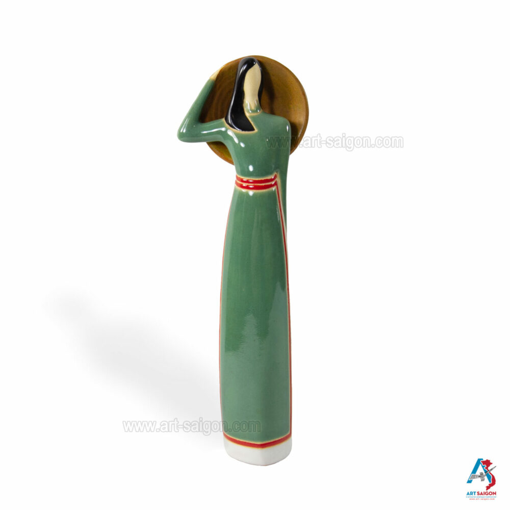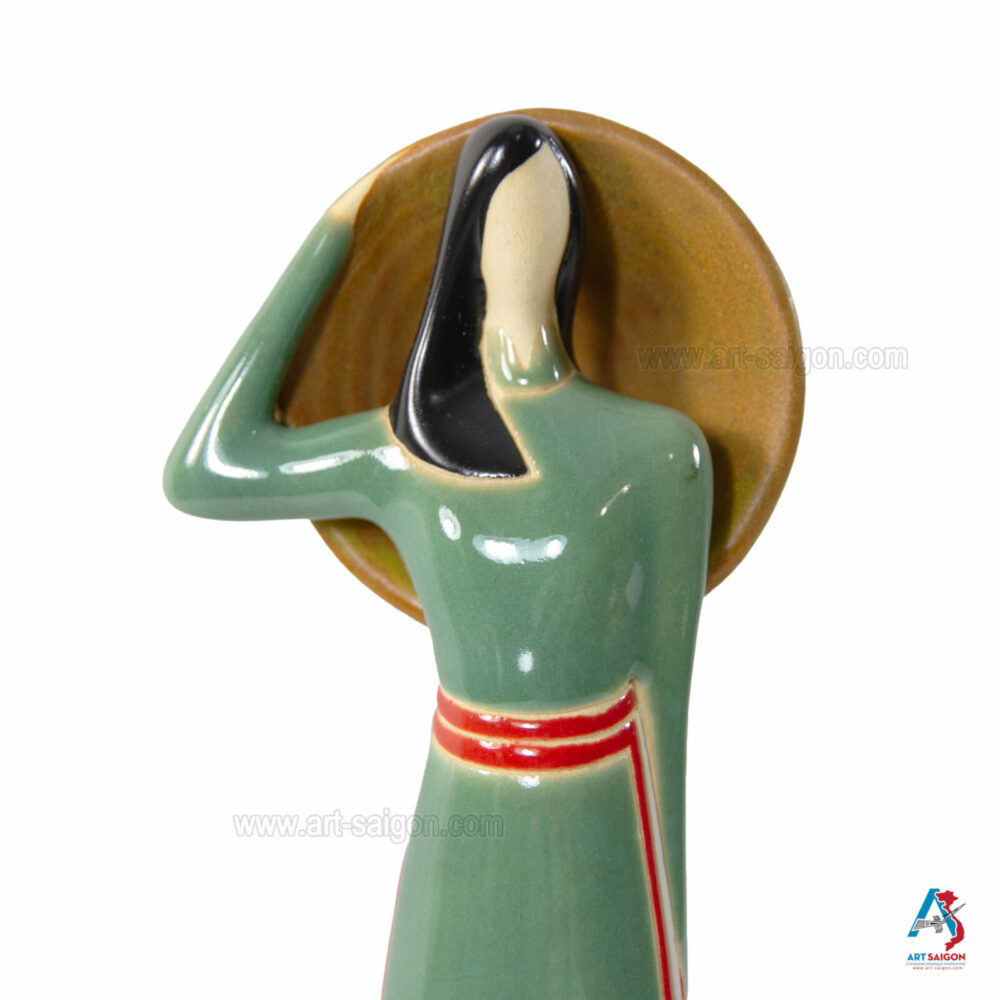 Cette statuette en terre cuite représente une jeune femme du Sud du Vietnam, vêtue d’un “áo dài” traditionnel du “Nam Bộ” en vert clair. Dans sa main, elle tient un “nón lá“, symbole de la vie rurale et de l’élégance simple des femmes du delta du Mékong.