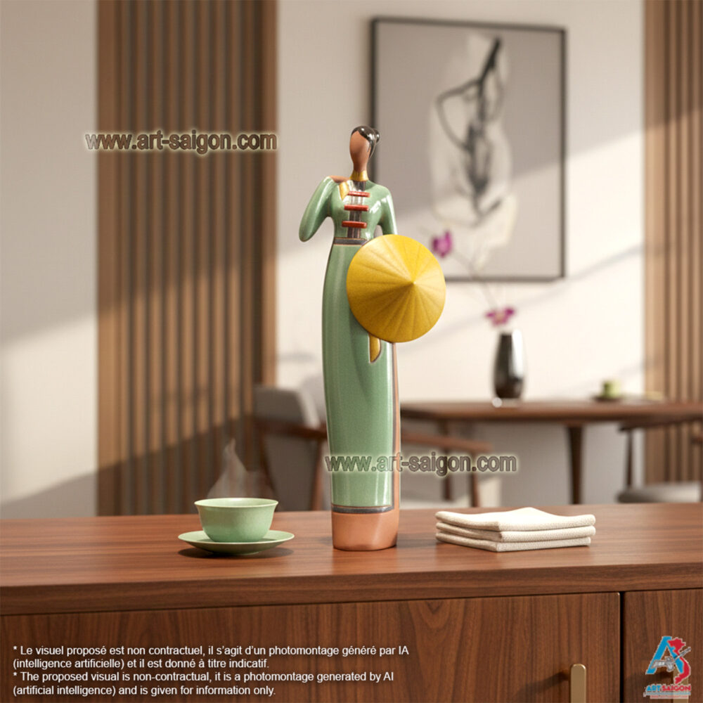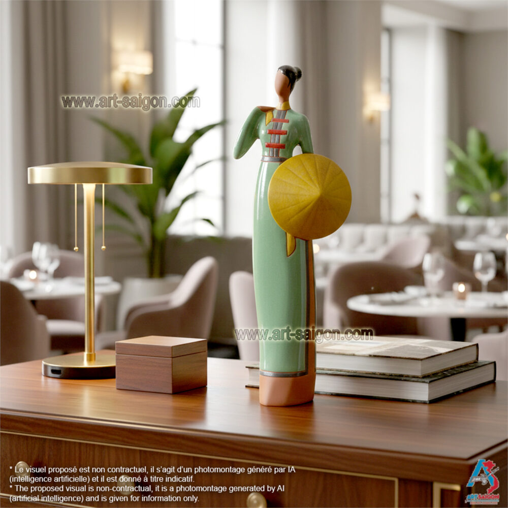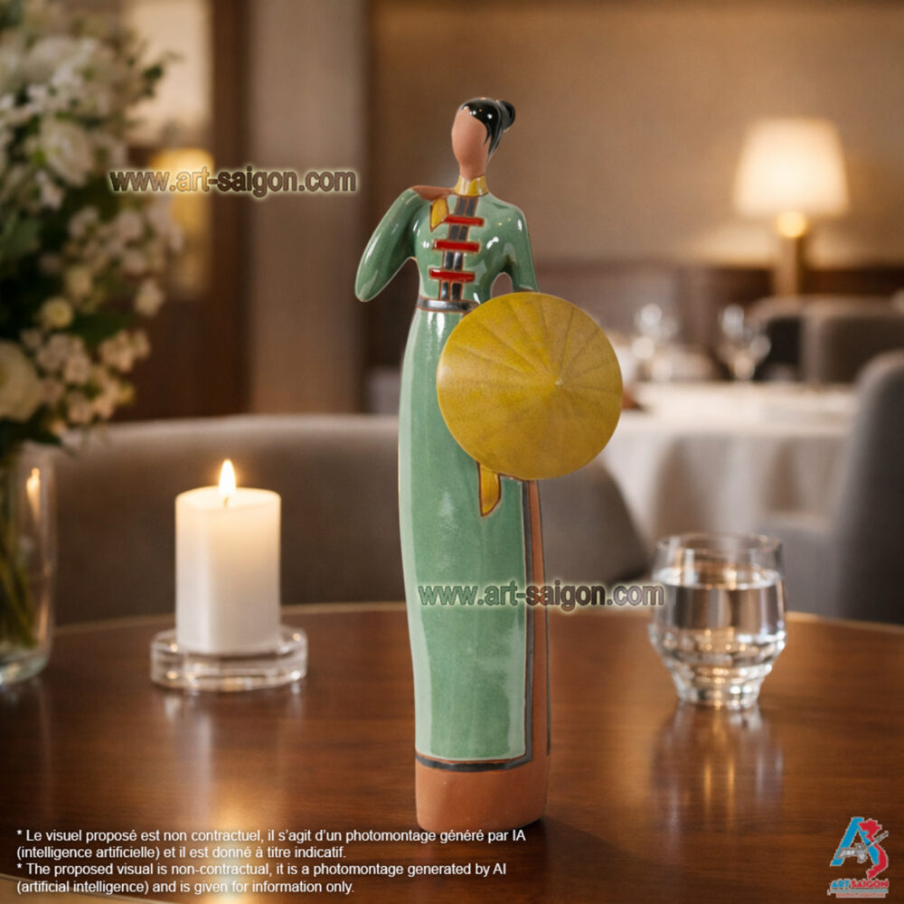 Cette statuette en terre cuite représente une jeune femme du Sud du Vietnam, vêtue d’un “áo dài” traditionnel du “Nam Bộ“. Dans sa main, elle tient un “nón lá“, symbole de la vie rurale et de l’élégance simple des femmes du delta du Mékong.