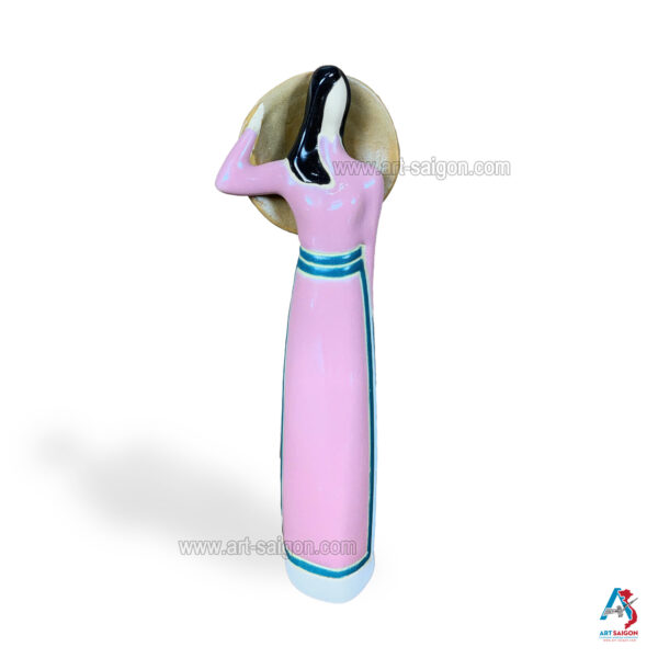 Cette statuette en terre cuite représente une jeune femme du Sud du Vietnam, vêtue d’un “áo dài” traditionnel du “Nam Bộ” en rose. Dans sa main, elle tient un “nón lá“, symbole de la vie rurale et de l’élégance simple des femmes du delta du Mékong.