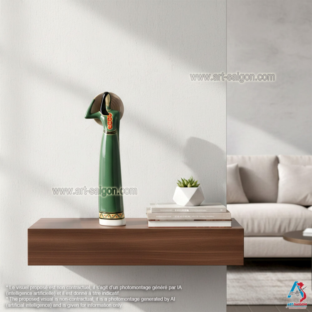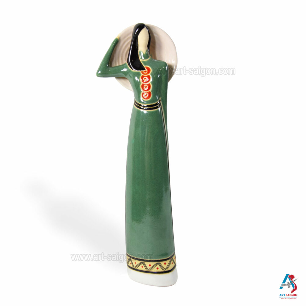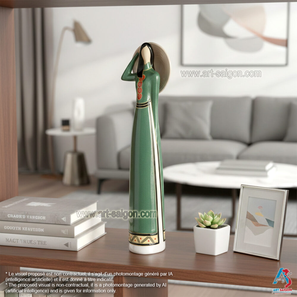 Cette statuette en terre cuite représente une jeune femme du Sud du Vietnam, vêtue d’un “áo dài” traditionnel du “Nam Bộ” en vert. Dans sa main, elle tient un “nón lá“, symbole de la vie rurale et de l’élégance simple des femmes du delta du Mékong.