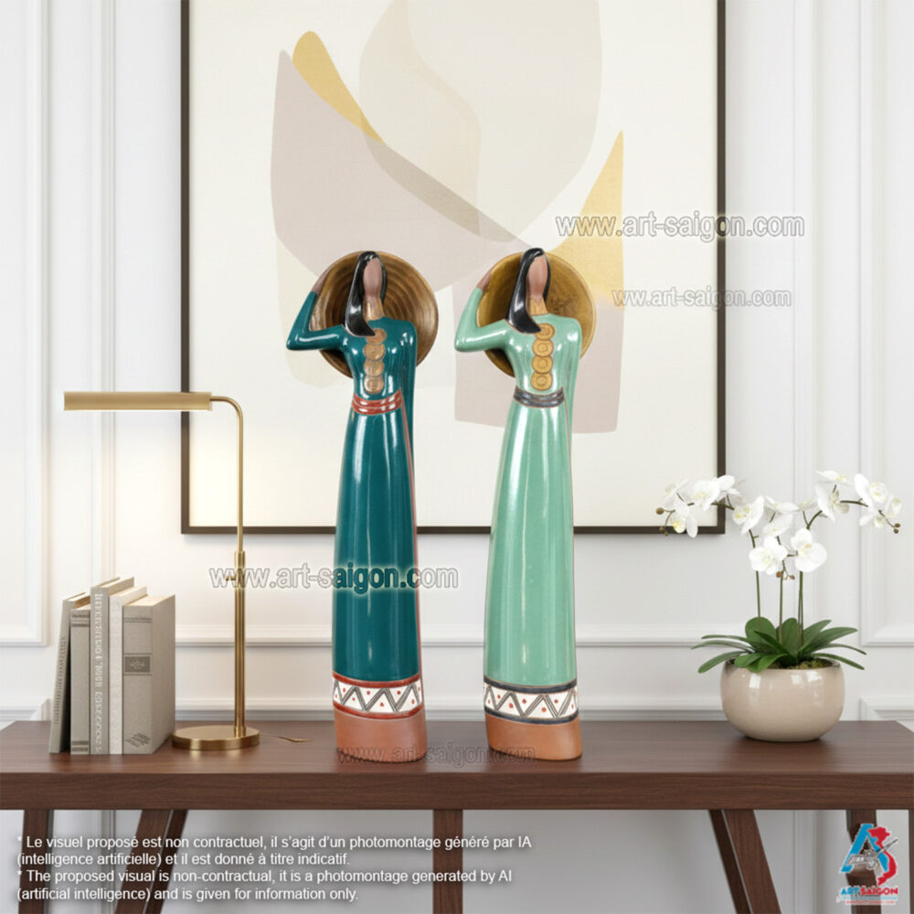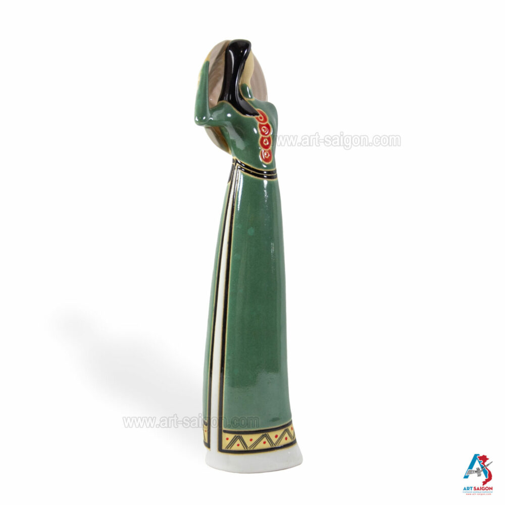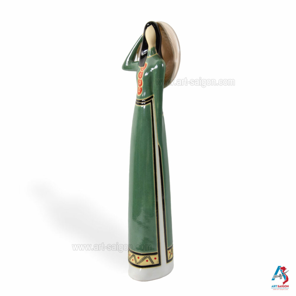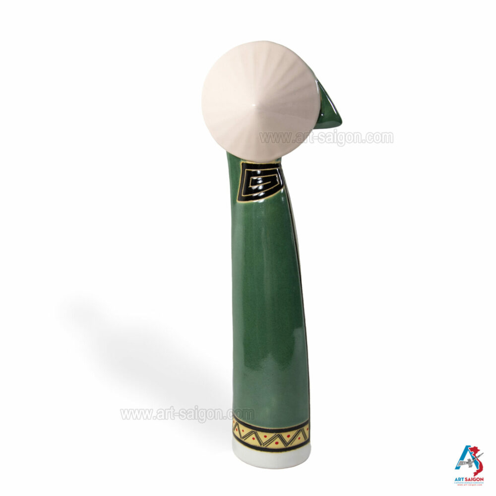 Cette statuette en terre cuite représente une jeune femme du Sud du Vietnam, vêtue d’un “áo dài” traditionnel du “Nam Bộ” en vert. Dans sa main, elle tient un “nón lá“, symbole de la vie rurale et de l’élégance simple des femmes du delta du Mékong.