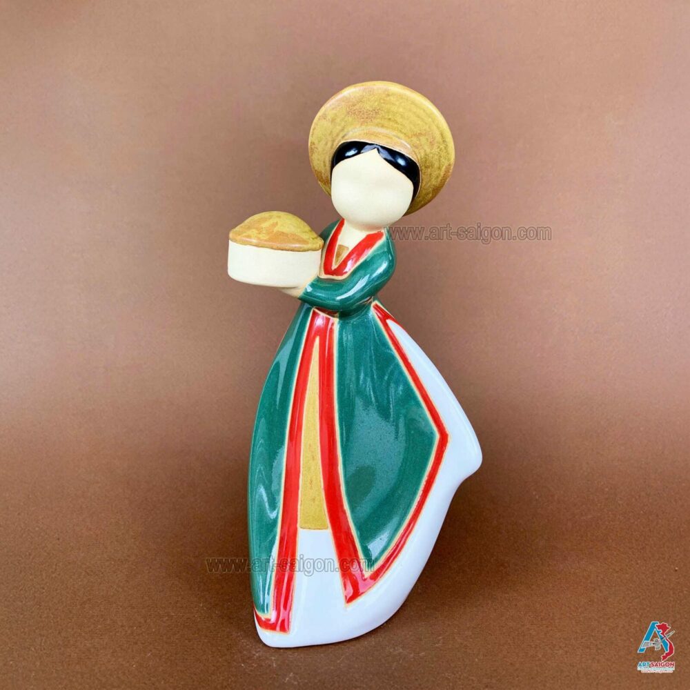 Cette statuette en terre cuite représente une jeune mariée vietnamienne vêtue d’un “áo tứ thân” traditionnel, de couleur verte bordée de rouge, accompagné d’une jupe blanche. Sur sa tête, elle porte un grand “mấn“, coiffe cérémonielle emblématique. Elle tient entre ses mains un plateau, complétant ainsi l’allure solennelle et raffinée propre aux cérémonies nuptiales traditionnelles.